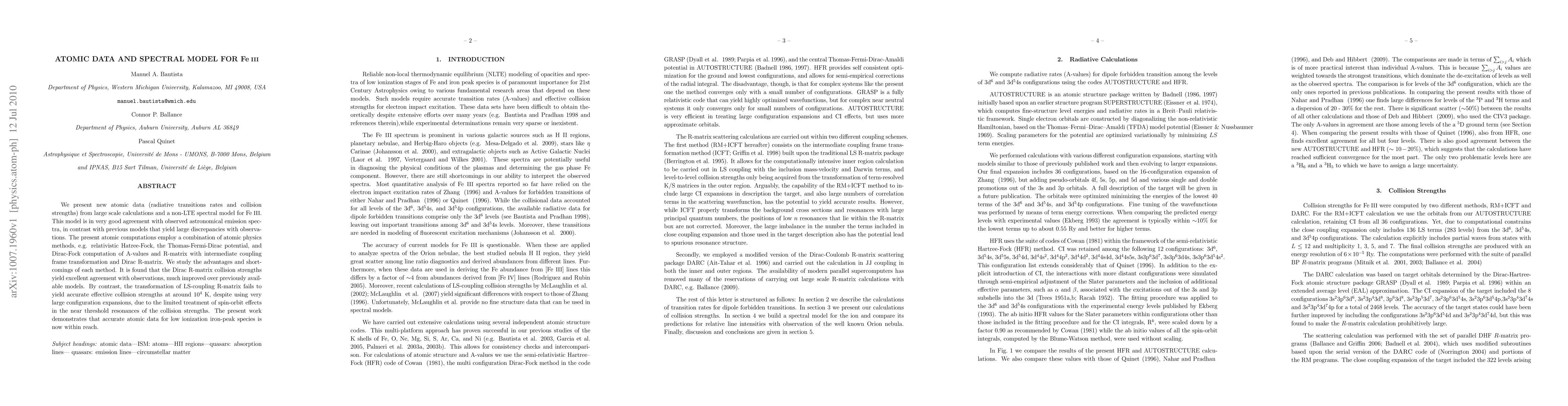 We present new atomic data (radiative transitions rates and collision strengths) from large scale calculations and a non-LTE spectral model for Fe III. This model is in very good agreement with observed astronomical emission spectra, in contrast with previous models that yield large discrepancies with observations. The present atomic computations employ a combination of atomic physics methods, e.g. relativistic Hatree-Fock, the Thomas-Fermi-Dirac potential, and Dirac-Fock computation of A-values and R-matrix with intermediate coupling frame transformation and Dirac R-matrix. We study the advantages and shortcomings of each method. It is found that the Dirac R-matrix collision strengths yield excellent agreement with observations, much improved over previously available models. By contrast, the transformation of LS-coupling R-matrix fails to yield accurate effective collision strengths at around 10^4 K, despite using very large configuration expansions, due to the limited treatment of spin-orbit effects in the near threshold resonances of the collision strengths. The present work demonstrates that accurate atomic data for low ionization iron-peak species is now within reach.