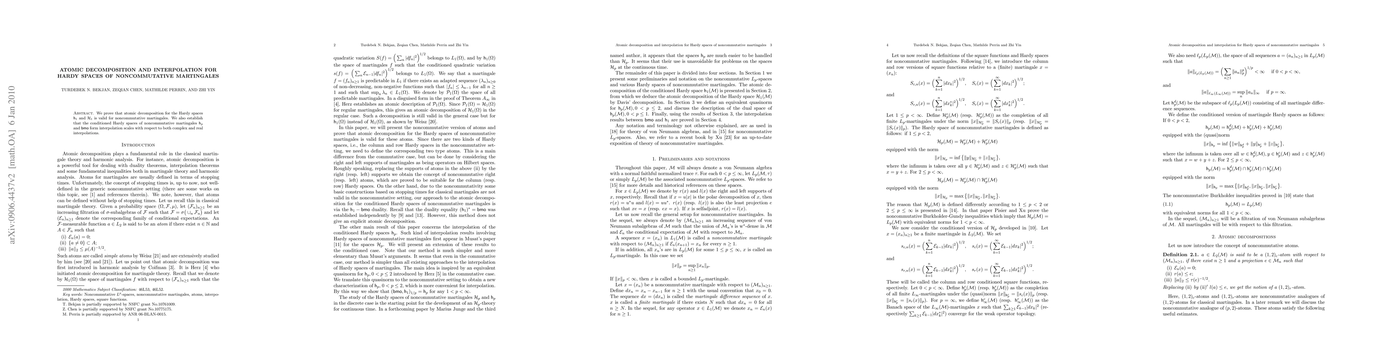Summary: This paper proves the atomic decomposition for Hardy spaces h_1 and H_1 in noncommutative martingales and establishes that conditioned Hardy spaces h_p and bmo serve as interpolation scales for both complex and real interpolations.