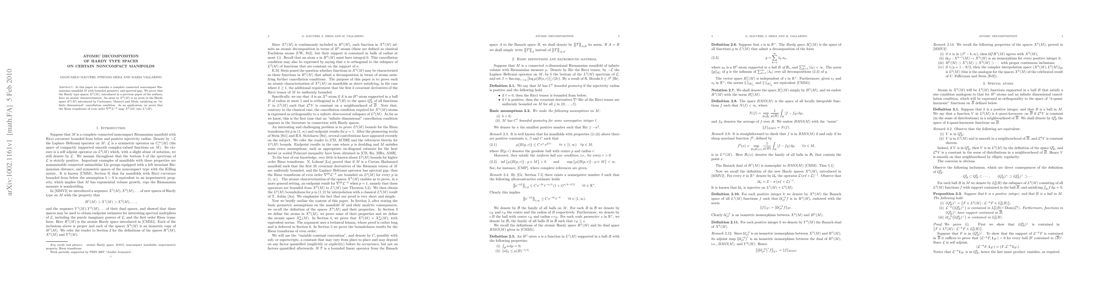 In this paper we consider a complete connected noncompact Riemannian manifold M with bounded geometry and spectral gap. We prove that the Hardy type spaces X^k(M), introduced in a previous paper of the authors, have an atomic characterization. As an application, we prove that the Riesz transforms of even order 2k are bounded from X^k(M) to L^1(M)and on L^p(M) for 1