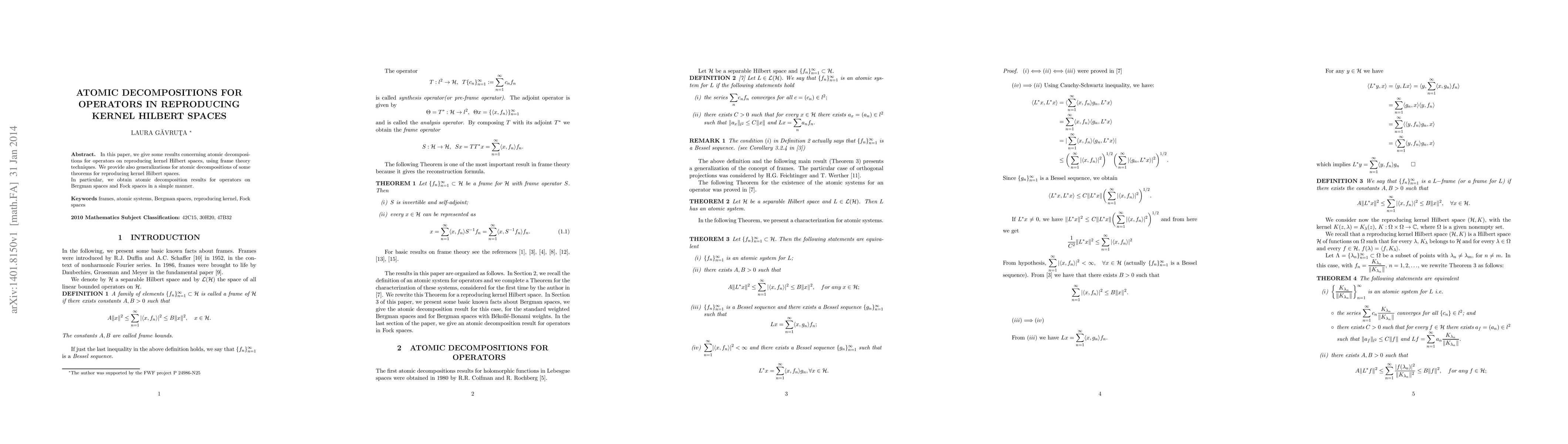 This paper presents atomic decompositions for operators in reproducing kernel Hilbert spaces utilizing frame theory, with specific results for Bergman and Fock spaces. It generalizes existing theorems and simplifies the atomic decomposition process for these operators.