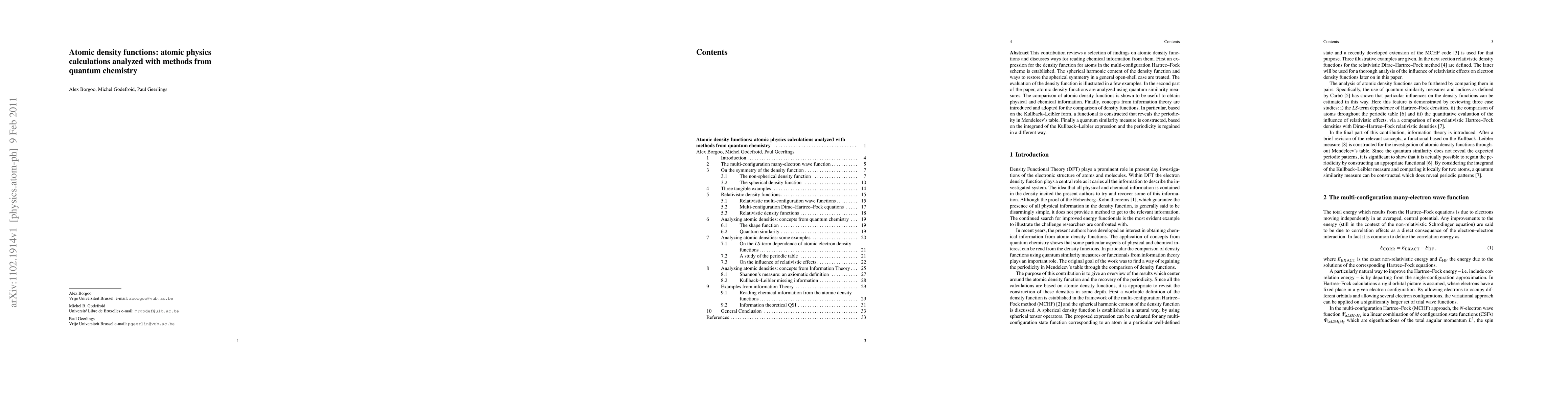 This contribution reviews a selection of findings on atomic density functions and discusses ways for reading chemical information from them. First an expression for the density function for atoms in the multi-configuration Hartree--Fock scheme is established. The spherical harmonic content of the density function and ways to restore the spherical symmetry in a general open-shell case are treated. The evaluation of the density function is illustrated in a few examples. In the second part of the paper, atomic density functions are analyzed using quantum similarity measures. The comparison of atomic density functions is shown to be useful to obtain physical and chemical information. Finally, concepts from information theory are introduced and adopted for the comparison of density functions. In particular, based on the Kullback--Leibler form, a functional is constructed that reveals the periodicity in Mendeleev's table. Finally a quantum similarity measure is constructed, based on the integrand of the Kullback--Leibler expression and the periodicity is regained in a different way.