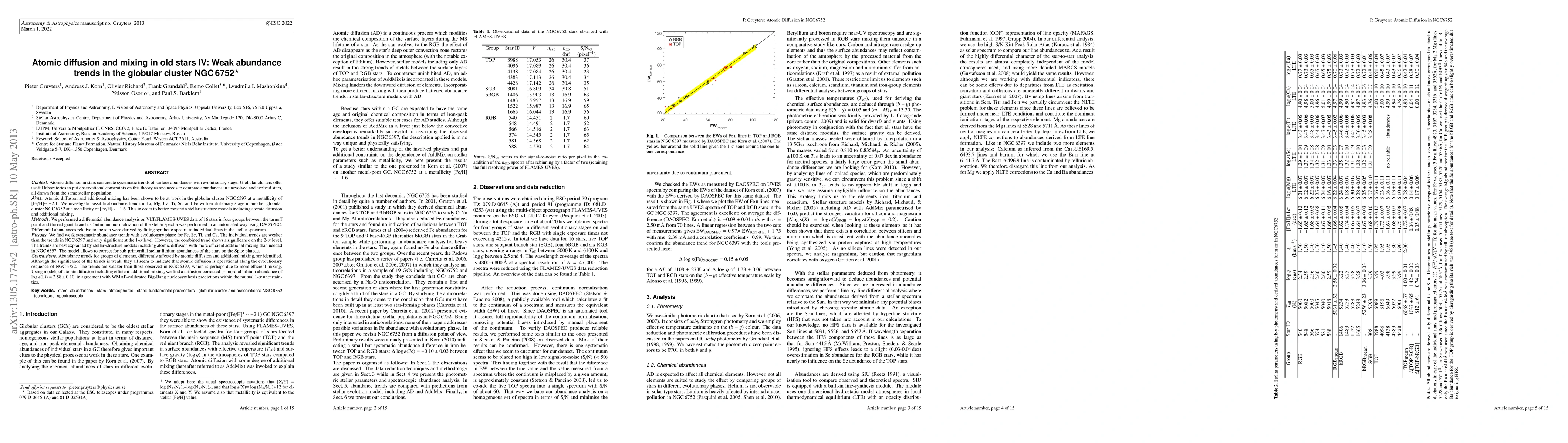 This paper investigates atomic diffusion and mixing in old stars within the globular cluster NGC 6752, revealing weak but systematic abundance trends for Fe, Sc, Ti, and Ca with evolutionary phase. The findings support a stellar structure model incorporating atomic diffusion and efficient additional mixing.