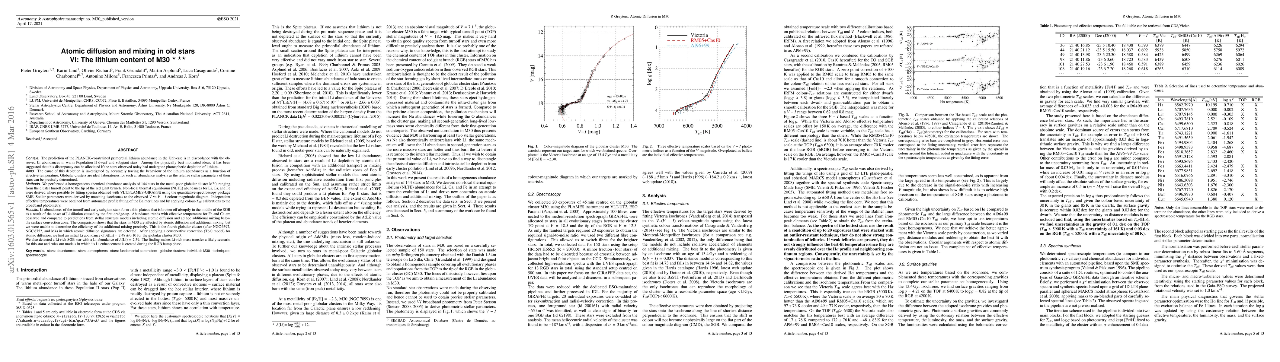 The prediction of the PLANCK-constrained primordial lithium abundance in the Universe is in discordance with the observed Li abundances in warm Population II dwarf and subgiant stars. Among the physically best motivated ideas, it has been suggested that this discrepancy can be alleviated if the stars observed today had undergone photospheric depletion of lithium. The cause of this depletion is investigated by accurately tracing the behaviour of the lithium abundances as a function of effective temperature. Globular clusters are ideal laboratories for such an abundance analysis as the relative stellar parameters of their stars can be precisely determined. We performed a homogeneous chemical abundance analysis of 144 stars in the metal-poor globular cluster M30, ranging from the cluster turnoff point to the tip of the red giant branch. NLTE abundances for Li, Ca, and Fe were derived where possible. Stellar parameters were derived by matching isochrones to the observed V vs V-I colour-magnitude diagram. Independent effective temperatures were obtained from automated profile fitting of the Balmer lines and by applying colour-T_eff calibrations to the broadband photometry. Li abundances of the turnoff and early subgiant stars form a thin plateau that is broken off abruptly in the middle of the SGB as a result of the onset of Li dilution caused by the first dredge-up. Abundance trends with effective temperature for Fe and Ca are observed and compared to predictions from stellar structure models including atomic diffusion and ad hoc additional mixing below the surface convection zone. The comparison shows that the stars in M30 are affected by atomic diffusion and additional mixing. After applying a conservative correction for atomic diffusion, we find an initial Li abundance of A(Li) = $2.48\pm0.10$ for the globular cluster M30.