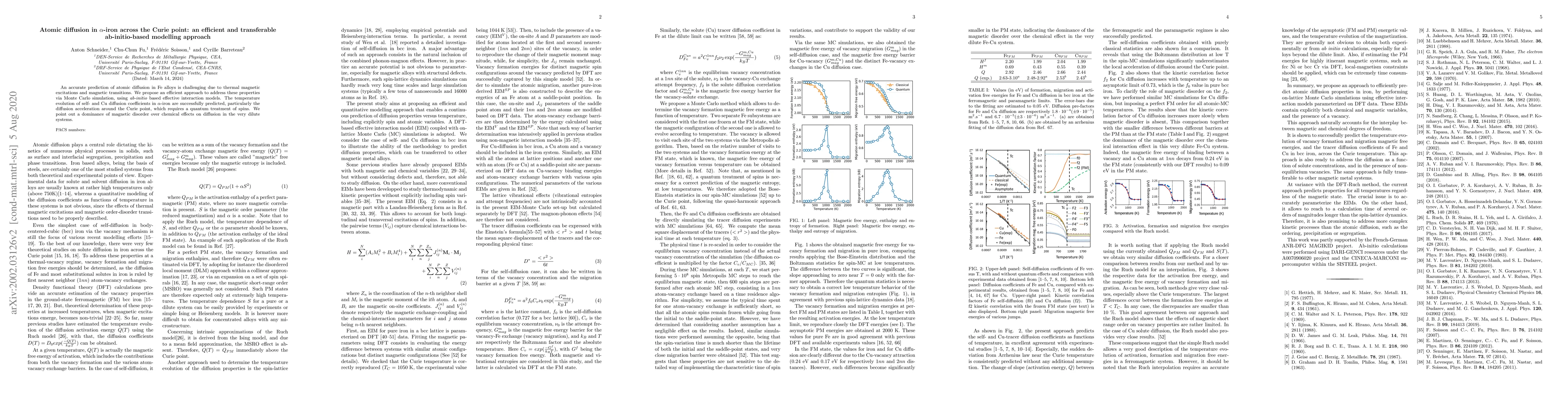 This paper proposes an efficient ab-initio-based modelling approach to predict atomic diffusion in Fe alloys, particularly focusing on the Curie point. The study successfully predicts the temperature evolution of diffusion coefficients using Monte Carlo simulations and highlights the dominance of magnetic disorder over chemical effects in dilute systems.