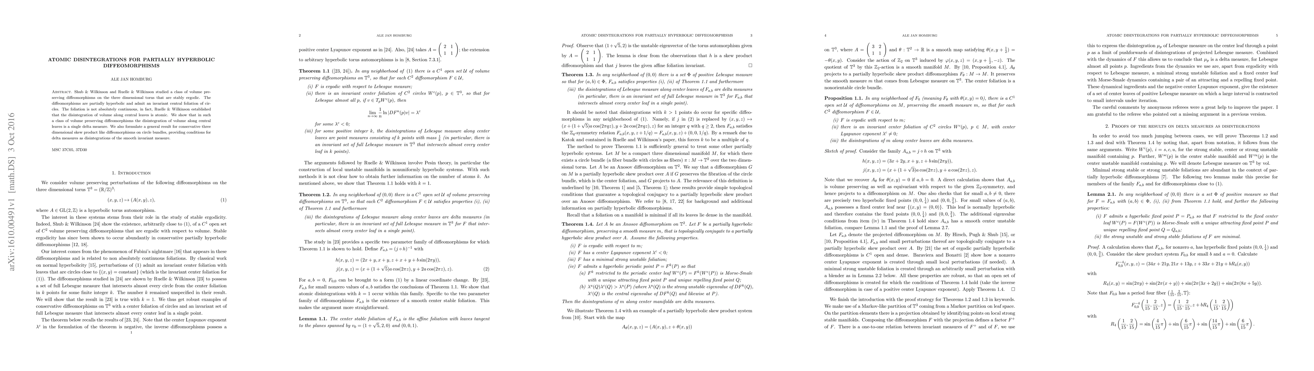 This paper demonstrates that for certain stably ergodic, partially hyperbolic diffeomorphisms on a three-dimensional torus, the volume disintegration along central leaves results in a single delta measure. The authors also extend their findings to a broader class of three-dimensional skew product diffeomorphisms on circle bundles, establishing conditions for delta measures in these systems.