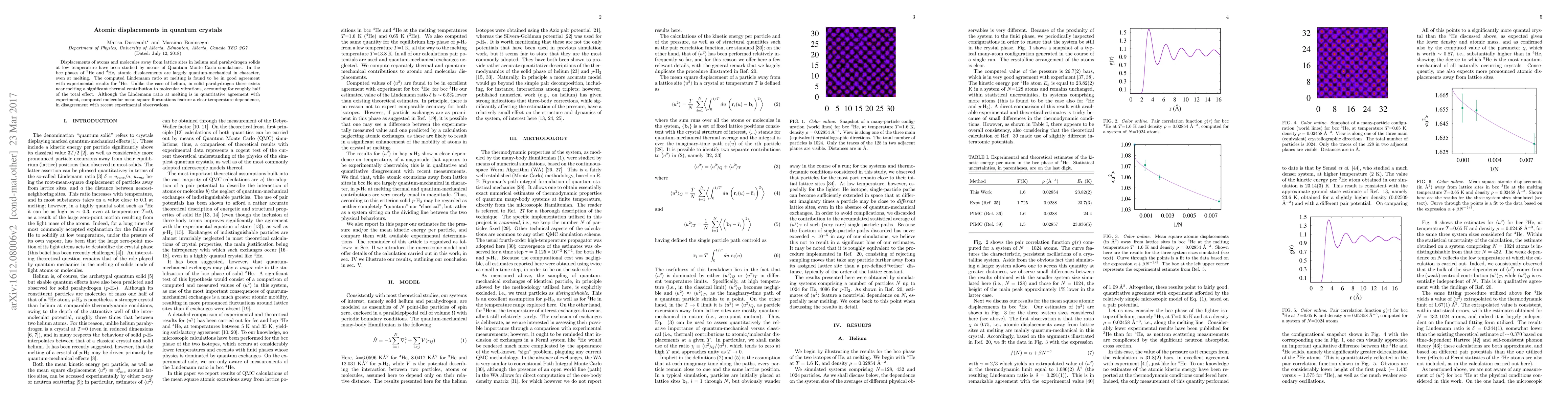 This study uses Quantum Monte Carlo simulations to investigate atomic and molecular displacements in helium and parahydrogen solids at low temperatures. Quantum effects dominate atomic displacements in helium, while thermal contributions significantly affect molecular vibrations in parahydrogen near melting, though simulation results for parahydrogen's molecular fluctuations differ from experimental observations.