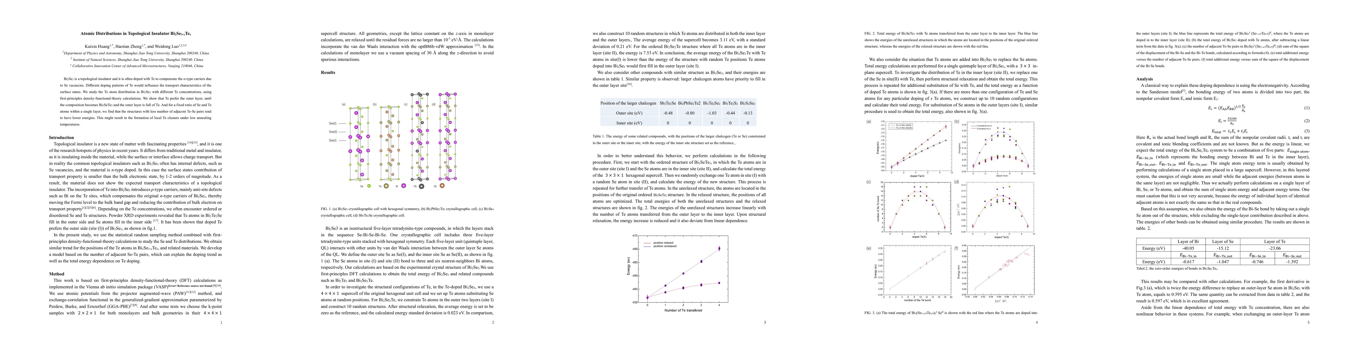 This study investigates Te atom distribution in doped Bi$_2$Se$_3$ topological insulators using density-functional-theory calculations, revealing that Te atoms prefer the outer layer, leading to local Te cluster formation under low annealing temperatures, especially when the outer layer is fully Te-saturated as in Bi$_2$SeTe$_2$. Structures with fewer adjacent Te-Se pairs exhibit lower energy.