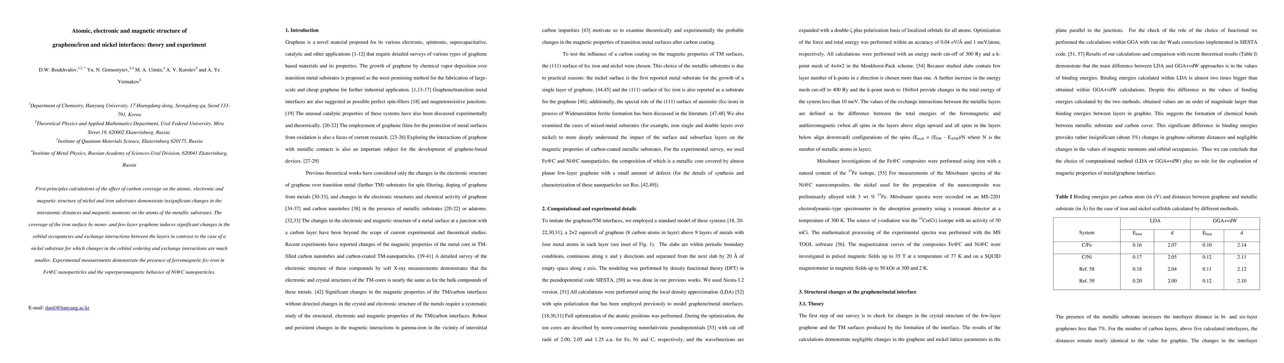 This study combines theoretical calculations and experimental measurements to investigate the atomic, electronic, and magnetic structure of graphene/iron and nickel interfaces. Theoretical results show minor changes in nickel and iron substrates under graphene coverage, with significant orbital and exchange interaction changes in iron compared to nickel. Experimental findings confirm ferromagnetic behavior in Fe@C nanoparticles and superparamagnetic behavior in Ni@C nanoparticles.