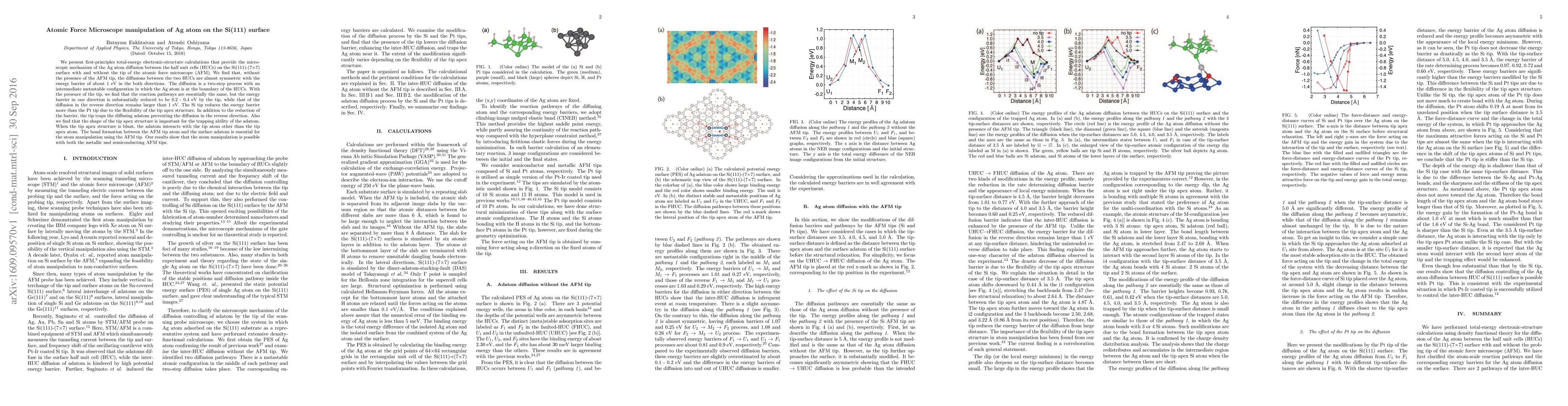 We present first-principles total-energy electronic-structure calculations that provide the microscopic mechanism of the Ag atom diffusion between the half unit cells (HUCs) on the Si(111)-(7x7) surface with and without the tip of the atomic force microscope (AFM). We find that, without the presence of the AFM tip, the diffusions between the two HUCs are almost symmetric with the energy barrier of about 1 eV in the both directions. The diffusion is a two-step process with an intermediate metastable configuration in which the Ag atom is at the boundary of the HUCs. With the presence of the tip, we find that the reaction pathways are essentially the same, but the energy barrier in one direction is substantially reduced to be 0.2 - 0.4 eV by the tip, while that of the diffusion in the reverse direction remains larger than 1 eV. The Si tip reduces the energy barrier more than the Pt tip due to the flexibility of the tip apex structure. In addition to the reduction of the barrier, the tip traps the diffusing adatom preventing the diffusion in the reverse direction. Also we find that the shape of the tip apex structure is important for the trapping ability of the adatom. When the tip apex structure is blunt, the adatom interacts with the tip atom other than the tip apex atom. The bond formation between the AFM tip atom and the surface adatom is essential for the atom manipulation using the AFM tip. Our results show that the atom manipulation is possible with both the metallic and semiconducting AFM tips.
