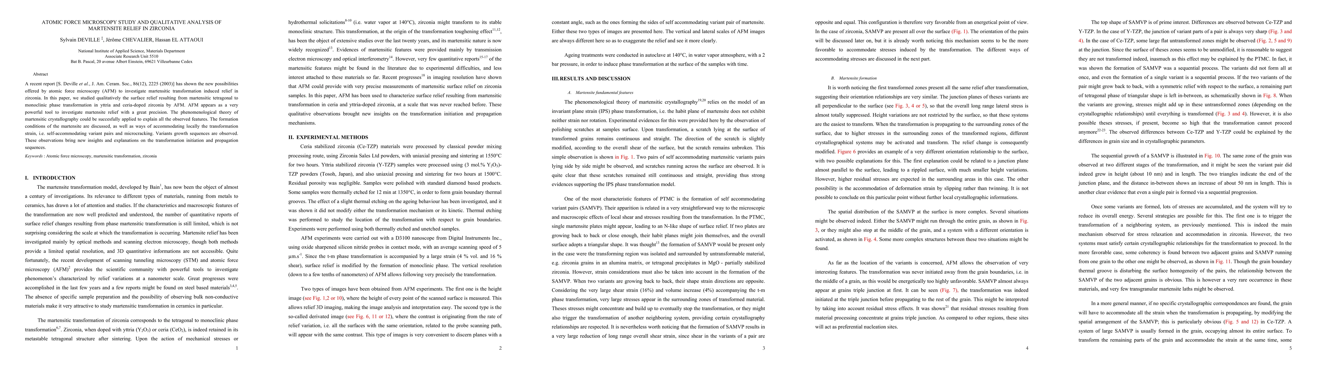 This paper uses atomic force microscopy (AFM) to qualitatively analyze martensitic transformation-induced relief in zirconia, revealing detailed insights into the transformation process and the formation conditions of martensite, including self-accommodating variant pairs and microcracking. The study confirms the effectiveness of AFM in precise investigation and supports the phenomenological theory of martensitic crystallography.