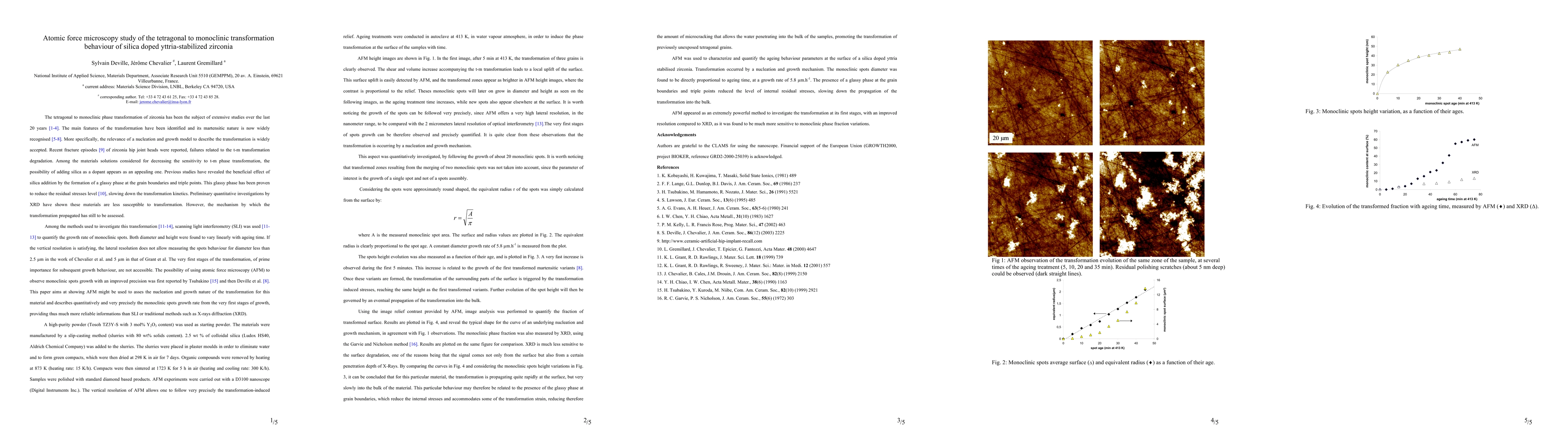 The tetragonal to monoclinic phase transformation of zirconia has been the subject of extensive studies over the last 20 years [1-4]. The main features of the transformation have been identified and its martensitic nature is now widely recognised [5-8]. More specifically, the relevance of a nucleation and growth model to describe the transformation is widely accepted. Recent fracture episodes [9] of zirconia hip joint heads were reported, failures related to the t-m transformation degradation. Among the materials solutions considered for decreasing the sensitivity to t-m phase transformation, the possibility of adding silica as a dopant appears as an appealing one. Previous studies have revealed the beneficial effect of silica addition by the formation of a glassy phase at the grain boundaries and triple points. This glassy phase has been proven to reduce the residual stresses level [10], slowing down the transformation kinetics. Preliminary quantitative investigations by XRD have shown these materials are less susceptible to transformation. However, the mechanism by which the transformation propagated has still to be assessed.