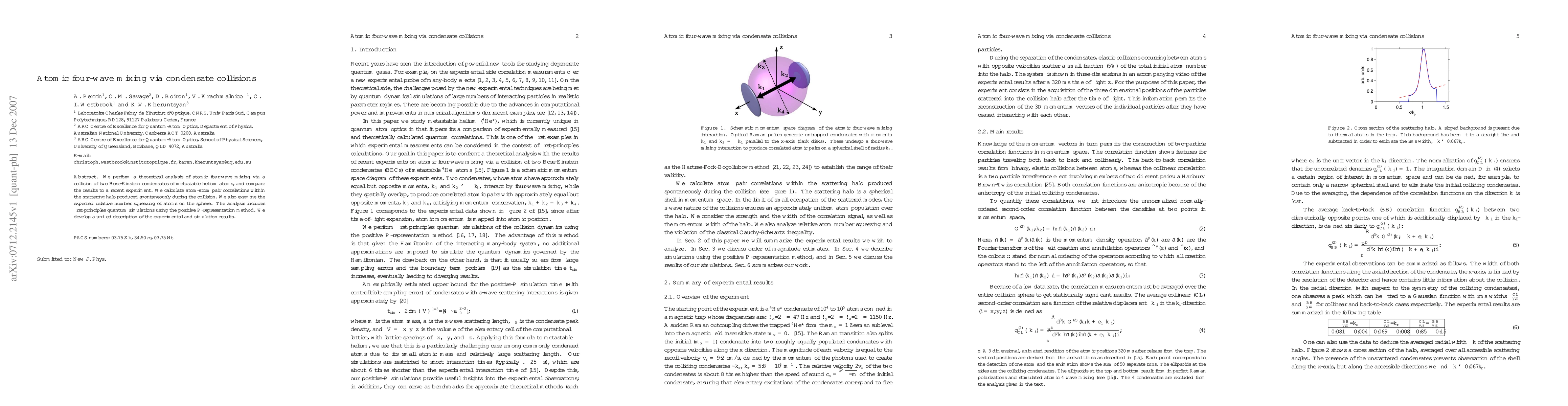 This paper theoretically analyzes atomic four-wave mixing during collisions of two Bose-Einstein condensates of metastable helium atoms, comparing results to recent experimental data and using quantum simulations to explore atom-pair correlations and relative number squeezing. A unified description is developed for both experimental and simulation findings.
