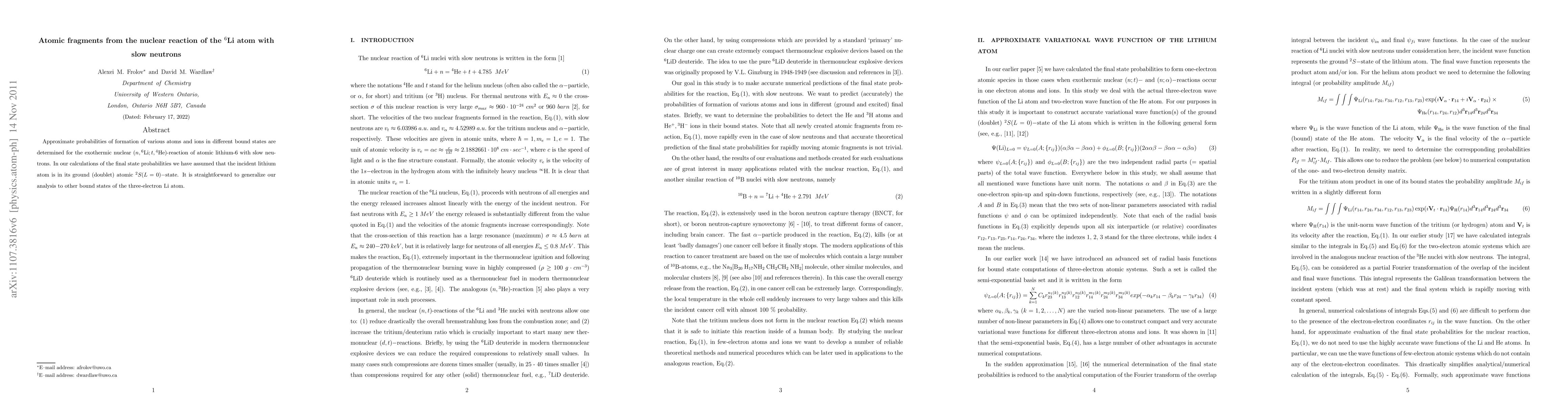 This research investigates the nuclear reaction of lithium-6 with slow neutrons, determining approximate probabilities for the formation of various atoms and ions in different states, assuming the lithium atom starts in its ground state. The study also suggests the analysis can be extended to other bound states of lithium.