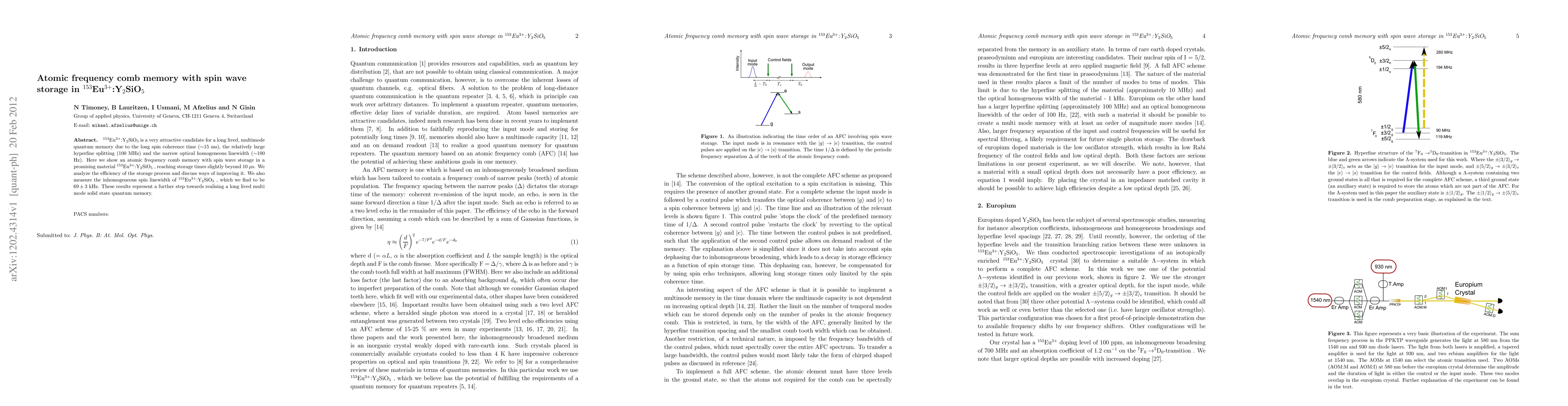 This paper demonstrates an atomic frequency comb memory utilizing spin wave storage in 153Eu3+:Y2SiO5, achieving storage times exceeding 10 μs. The study analyzes storage efficiency and proposes improvements, while also measuring the material's inhomogeneous spin linewidth at 69 ± 3 kHz, advancing the development of long-lived multimode quantum memories.