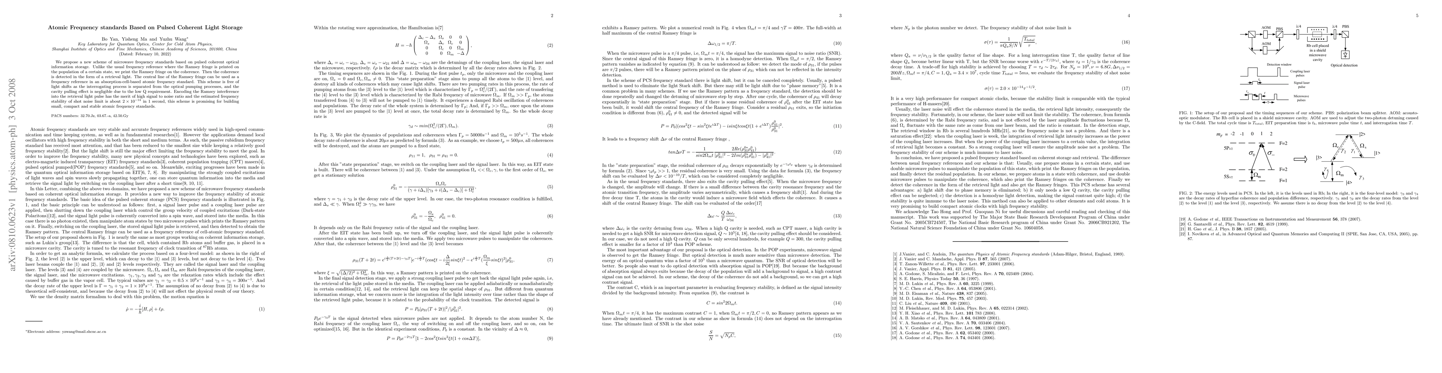 This paper proposes a novel microwave frequency standard using pulsed coherent optical information storage, where the Ramsey fringe is imprinted on coherence rather than population, leading to a high signal-to-noise ratio and negligible light shifts. The scheme promises a frequency stability of $2\times10^{-14}$ in 1 second, making it ideal for compact atomic frequency standards.