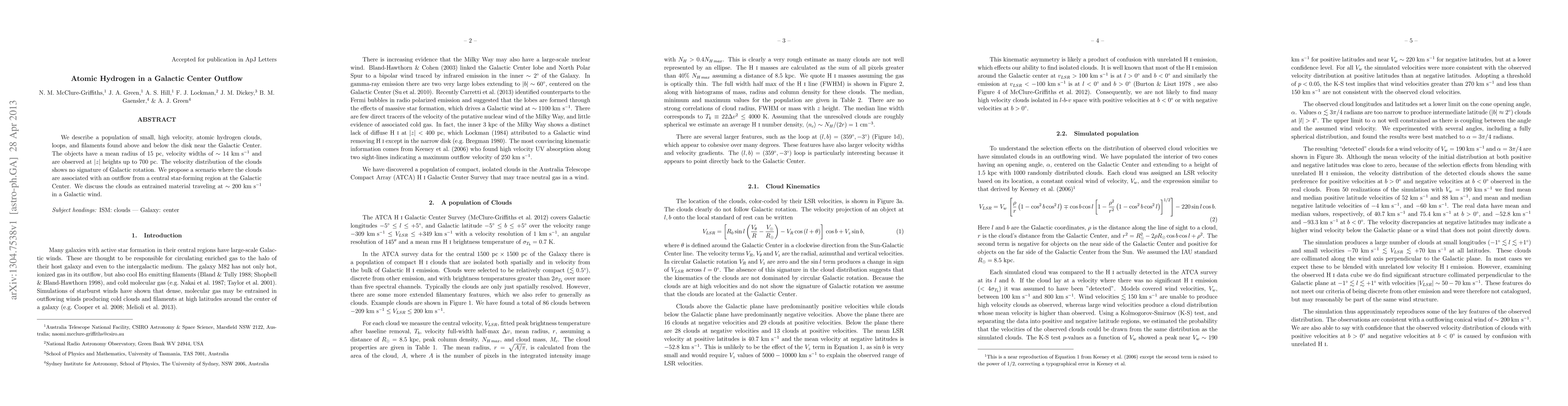 This study identifies high-velocity atomic hydrogen clouds near the Galactic Center, suggesting they are part of an outflow from a central star-forming region rather than influenced by Galactic rotation. The clouds are observed at heights up to 700 pc and travel at approximately 200 km/s within a galactic wind.