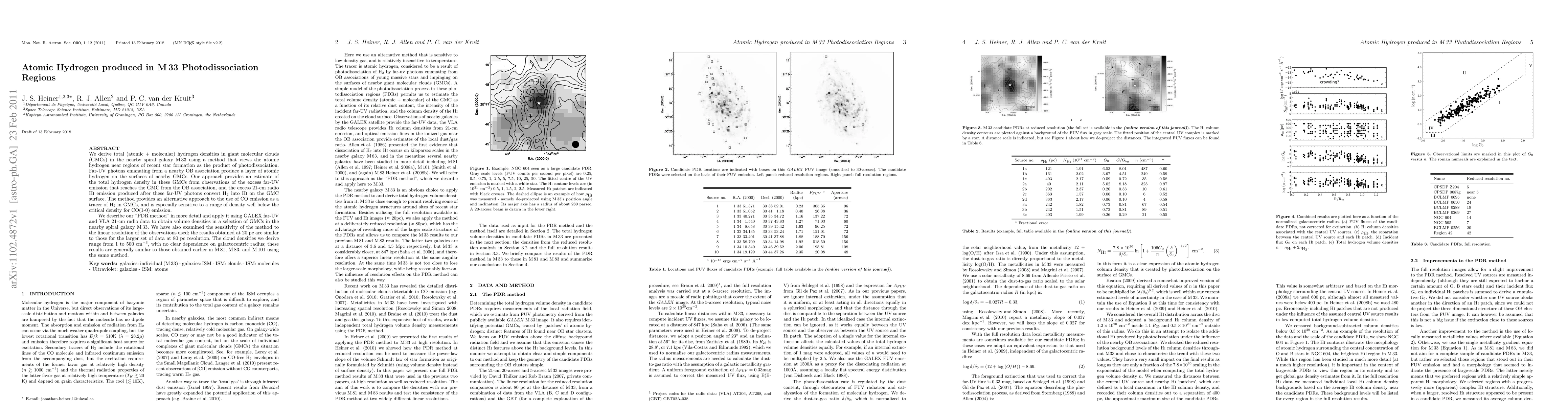 This paper introduces a "PDR method" to estimate total hydrogen densities in giant molecular clouds (GMCs) in M33, based on the conversion of H2 to atomic hydrogen (HI) by far-UV photons from nearby OB associations. The method provides densities ranging from 1 to 500 cm-3, comparable to earlier results in other spiral galaxies, and is sensitive to lower densities than CO emission.