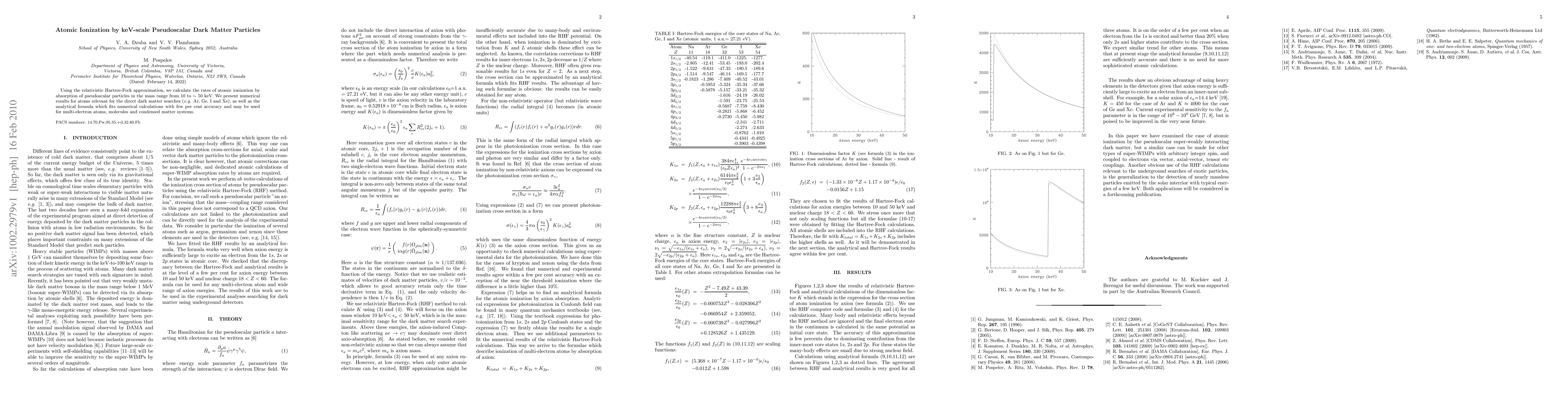 This paper calculates ionization rates of atoms like Ar, Ge, I, and Xe due to keV-scale pseudoscalar dark matter particles using the relativistic Hartree-Fock approximation. It provides an analytical formula that fits numerical results with a few percent accuracy, applicable to multi-electron atoms, molecules, and condensed matter systems.
