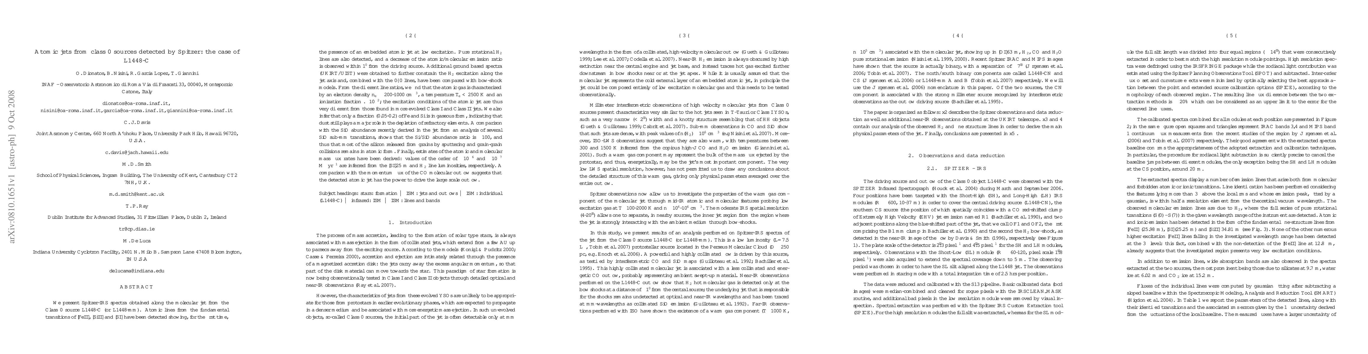 We present Spitzer-IRS spectra obtained along the molecular jet from the Class 0 source L1448-C (or L1448-mm). Atomic lines from the fundamental transitions of [FeII], [SiII] and [SI] have been detected showing, for the first time, the presence of an embedded atomic jet at low excitation. Pure rotational H$_2$ lines are also detected, and a decrease of the atomic/molecular emission ratio is observed within 1 arcmin from the driving source. Additional ground based spectra (UKIRT/UIST) were obtained to further constrain the H$_2$ excitation along the jet axis and, combined with the 0--0 lines, have been compared with bow-shock models. From the different line ratios, we find that the atomic gas is characterized by an electron density n_e ~ 200-1000 cm^{-3}, a temperature T_e < 2500 K and an ionization fraction <~ 10^{-2}; the excitation conditions of the atomic jet are thus very different from those found in more evolved Class I and Class II jets. We also infer that only a fraction (0.05-0.2) of Fe and Si is in gaseous form, indicating that dust still plays a major role in the depletion of refractory elements. A comparison with the SiO abundance recently derived in the jet from an analysis of several SiO sub-mm transitions, shows that the Si/SiO abundance ratio is ~100, and thus that most of the silicon released from grains by sputtering and grain-grain collisions remains in atomic form. Finally, estimates of the atomic and molecular mass flux rates have been derived: values of the order of ~10$^{-6}$ and ~10$^{-7}$ M$_{\sun}$ yr$^{-1}$ are inferred from the [SI]25$\mu$m and H$_2$ line luminosities, respectively. A comparison with the momentum flux of the CO molecular outflow suggests that the detected atomic jet has the power to drive the large scale outflow.