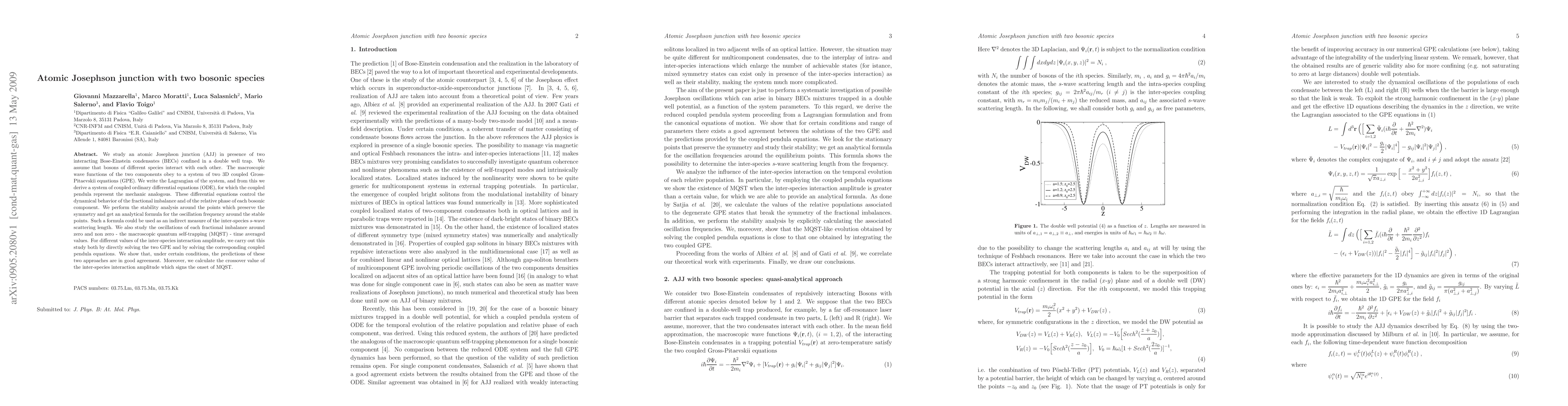 This paper investigates an atomic Josephson junction with two interacting bosonic species in a double-well trap, modeled by coupled Gross-Pitaevskii equations. It derives analytical formulas for oscillation frequencies and examines stability, providing a measure for inter-species scattering length and predicting the onset of macroscopic quantum self-trapping.