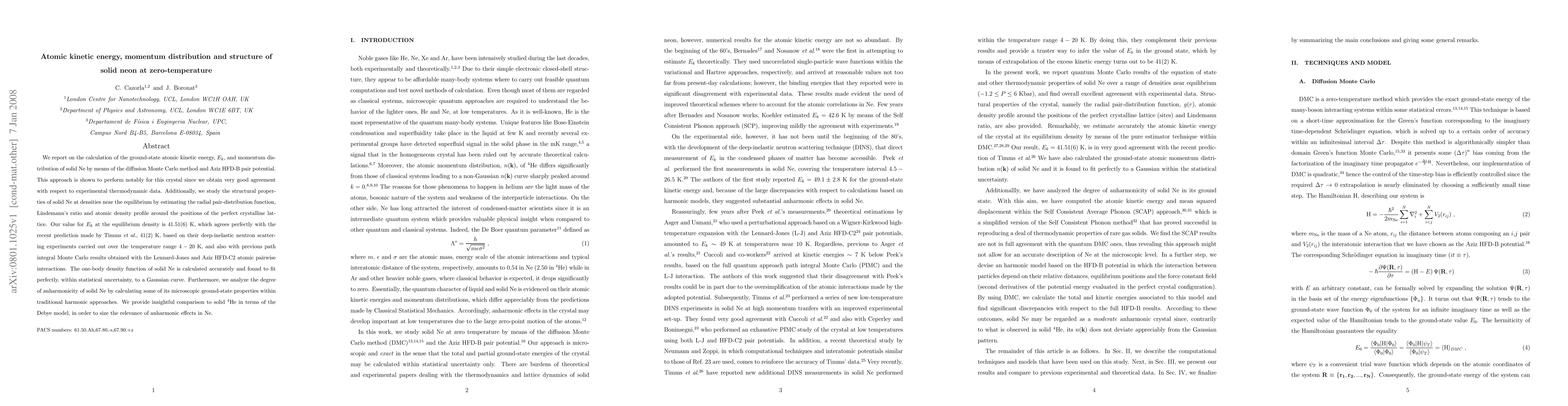 We report on the calculation of the ground-state atomic kinetic energy, $E_{k}$, and momentum distribution of solid Ne by means of the diffusion Monte Carlo method and Aziz HFD-B pair potential. This approach is shown to perform notably for this crystal since we obtain very good agreement with respect to experimental thermodynamic data. Additionally, we study the structural properties of solid Ne at densities near the equilibrium by estimating the radial pair-distribution function, Lindemann's ratio and atomic density profile around the positions of the perfect crystalline lattice. Our value for $E_{k}$ at the equilibrium density is $41.51(6)$ K, which agrees perfectly with the recent prediction made by Timms {\it et al.}, $41(2)$ K, based on their deep-inelastic neutron scattering experiments carried out over the temperature range $4 - 20$ K, and also with previous path integral Monte Carlo results obtained with the Lennard-Jones and Aziz HFD-C2 atomic pairwise interactions. The one-body density function of solid Ne is calculated accurately and found to fit perfectly, within statistical uncertainty, to a Gaussian curve. Furthermore, we analyze the degree of anharmonicity of solid Ne by calculating some of its microscopic ground-state properties within traditional harmonic approaches. We provide insightful comparison to solid $^4$He in terms of the Debye model, in order to size the relevance of anharmonic effects in Ne.