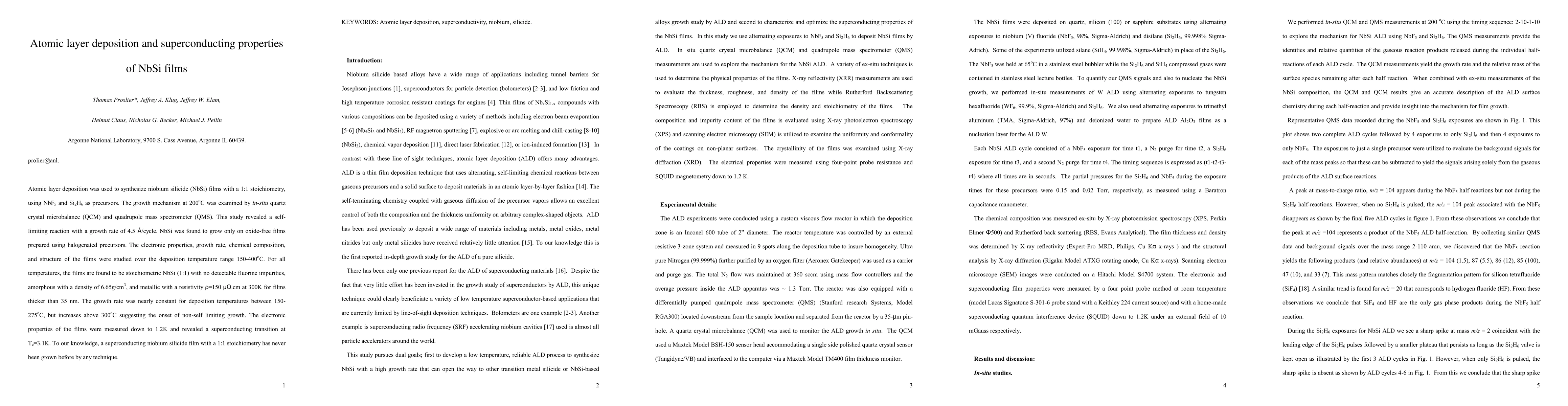 This study synthesizes niobium silicide (NbSi) films using atomic layer deposition with a self-limiting reaction mechanism, revealing a superconducting transition at Tc=3.1K, marking the first time a stoichiometric NbSi film with such properties has been achieved. The films exhibit metallic characteristics and a superconducting transition temperature below previously reported values.