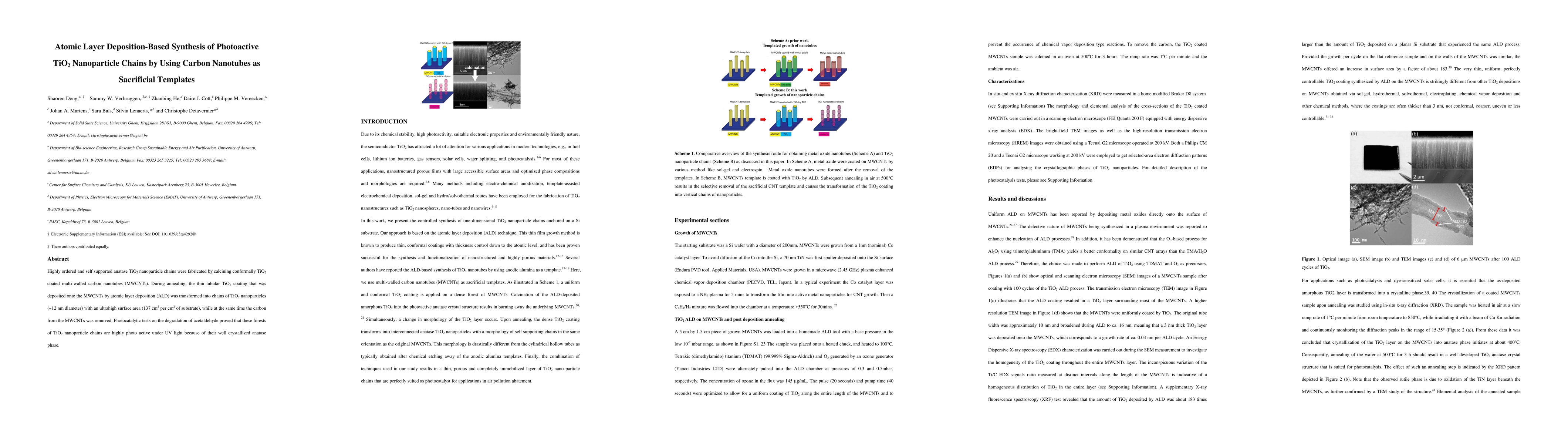 Summary: The paper describes a method for creating highly ordered TiO2 nanoparticle chains using ALD on carbon nanotubes, which act as sacrificial templates. The resultant TiO2 chains exhibit high photoactivity for UV-light-induced acetaldehyde degradation due to their well-crystallized anatase phase and large surface area.
