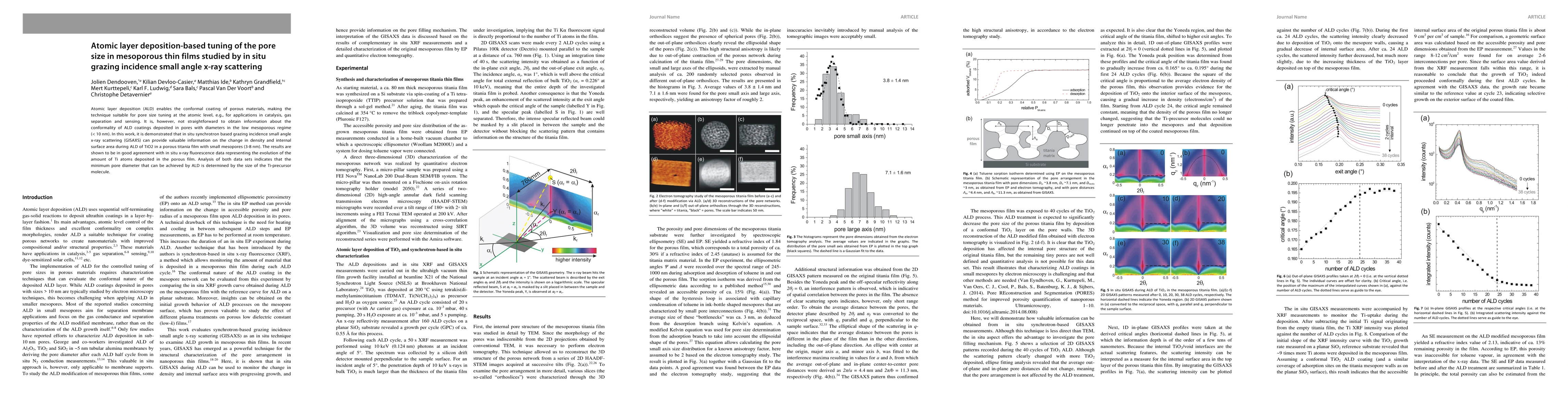 This paper demonstrates the use of in situ grazing incidence small angle x-ray scattering (GISAXS) to monitor atomic layer deposition (ALD) of TiO2 in mesoporous films, revealing changes in pore size and internal surface area. The study finds that the minimum pore diameter achievable by ALD is constrained by the size of the Ti-precursor molecule.