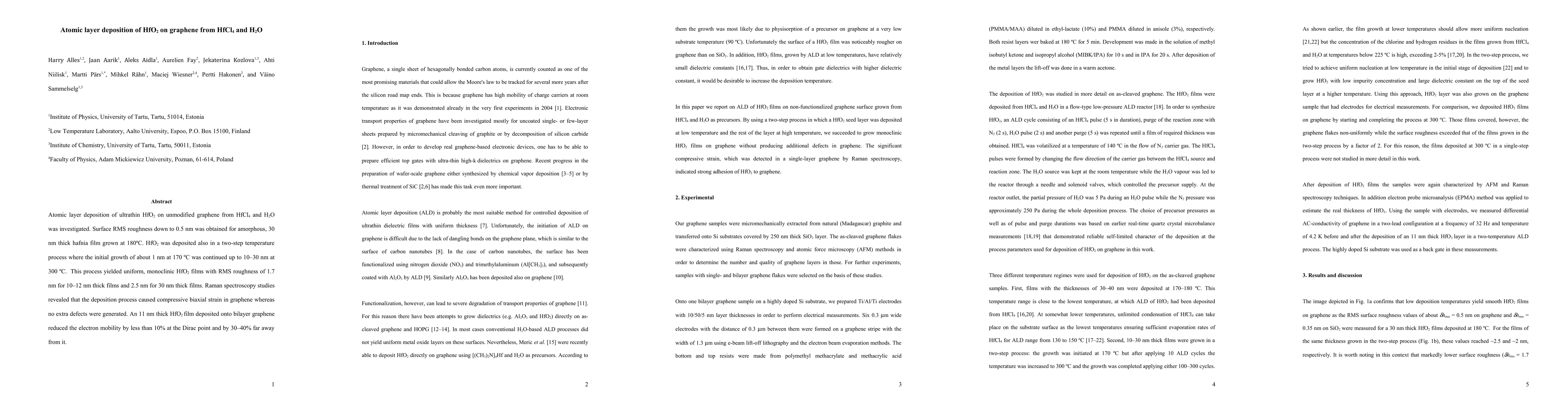 This study investigates the atomic layer deposition of ultrathin HfO2 on graphene using HfCl4 and H2O, achieving surface RMS roughness as low as 0.5 nm for 30 nm films at 180°C, and compressive strain in graphene without extra defects. The two-step temperature process produced uniform, monoclinic HfO2 films, reducing electron mobility by less than 10% at the Dirac point.