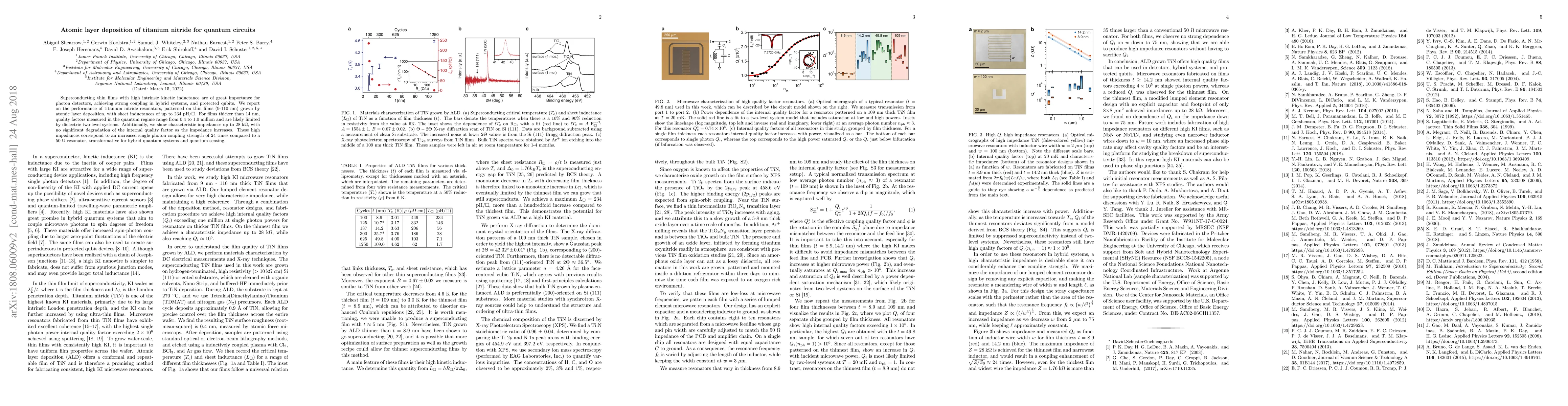 This paper investigates the atomic layer deposition of titanium nitride thin films for quantum circuits, reporting high intrinsic kinetic inductance and quality factors up to 1.0 million for 14 nm thick films, with significant enhancements in single photon coupling strength.