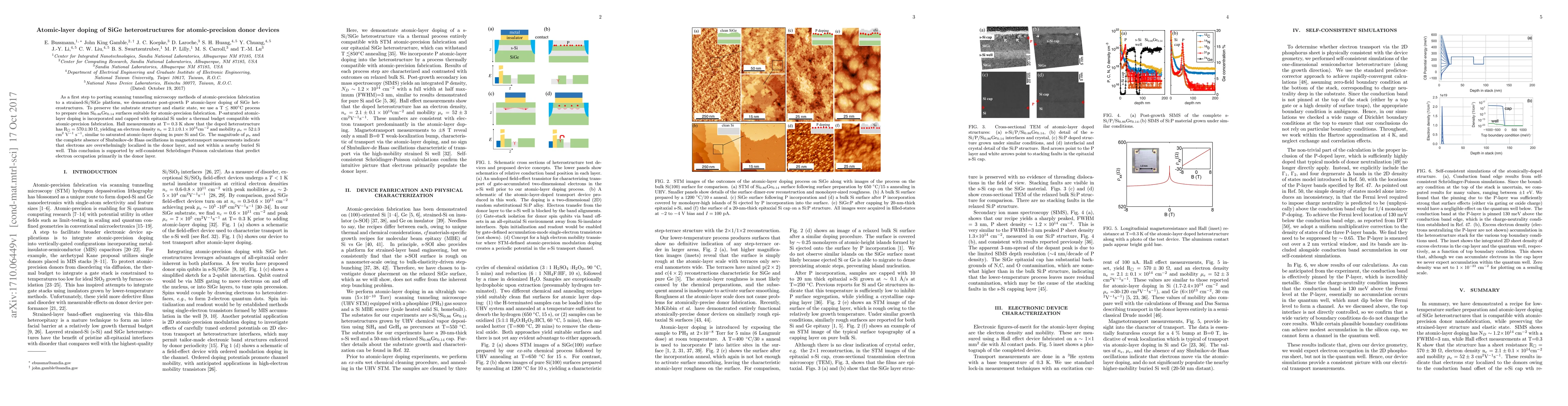 This paper demonstrates atomic-layer doping of SiGe heterostructures at low temperatures to achieve atomic-precision fabrication, resulting in localized electron behavior in the donor layer, verified by Hall measurements and magnetotransport studies. Self-consistent calculations further support the predicted electron localization.