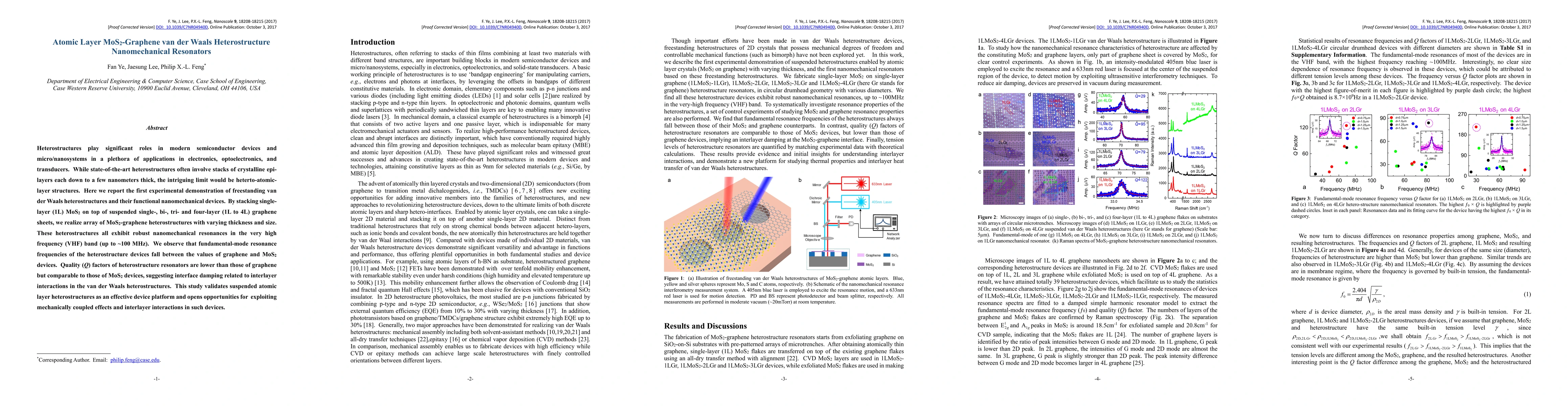 This research demonstrates the first experimental realization of freestanding atomic layer van der Waals heterostructures composed of single-layer MoS2 stacked on suspended graphene sheets, showing robust nanomechanical resonances up to ~100 MHz. The study highlights the potential of these heterostructures for electronic and optoelectronic applications, noting the observed damping effects due to interlayer interactions.
