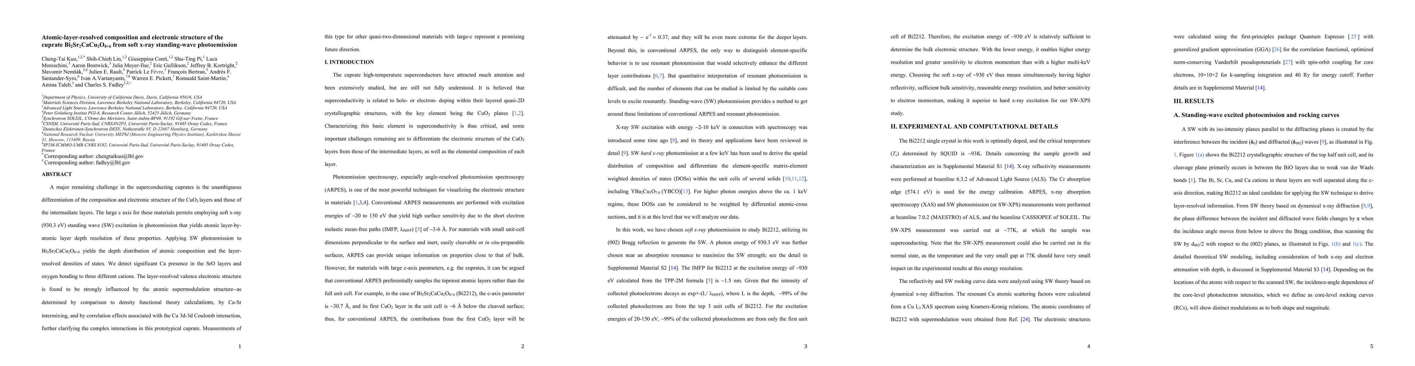 A major remaining challenge in the superconducting cuprates is the unambiguous differentiation of the composition and electronic structure of the CuO$_2$ layers and those of the intermediate layers. The large c axis for these materials permits employing soft x-ray (930.3 eV) standing wave (SW) excitation in photoemission that yields atomic layer-by-atomic layer depth resolution of these properties. Applying SW photoemission to Bi$_2$Sr$_2$CaCu$_2$O$_{8+\delta}$ yields the depth distribution of atomic composition and the layer-resolved densities of states. We detect significant Ca presence in the SrO layers and oxygen bonding to three different cations. The layer-resolved valence electronic structure is found to be strongly influenced by the supermodulation structure--as determined by comparison to DFT calculations, by Ca-Sr intermixing, and by the Cu 3d-3d Coulomb interaction, further clarifying the complex interactions in this prototypical cuprate. Measurements of this type for other quasi-two-dimensional materials with large-c represent a promising future direction.