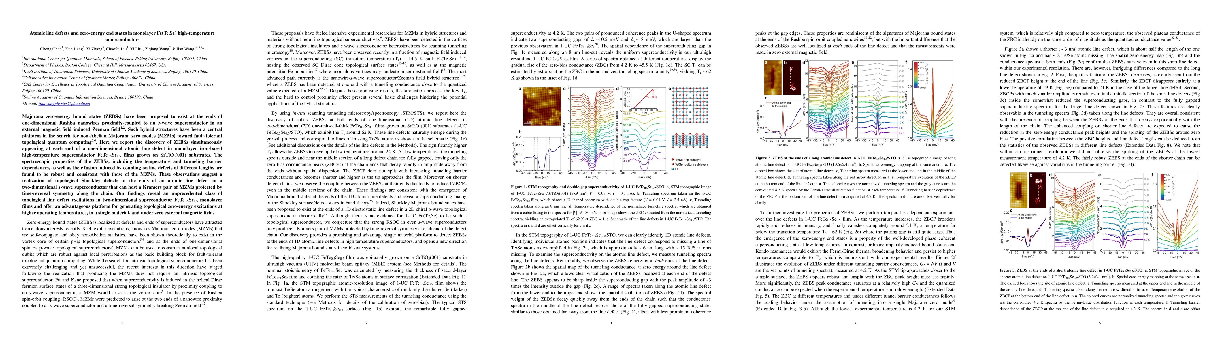This paper reports the discovery of Majorana zero-energy bound states (ZEBSs) at atomic line defects in monolayer FeTe0.5Se0.5 superconductors, suggesting a new class of topological excitations and a potential platform for topological quantum computing at higher temperatures without external magnetic fields.
