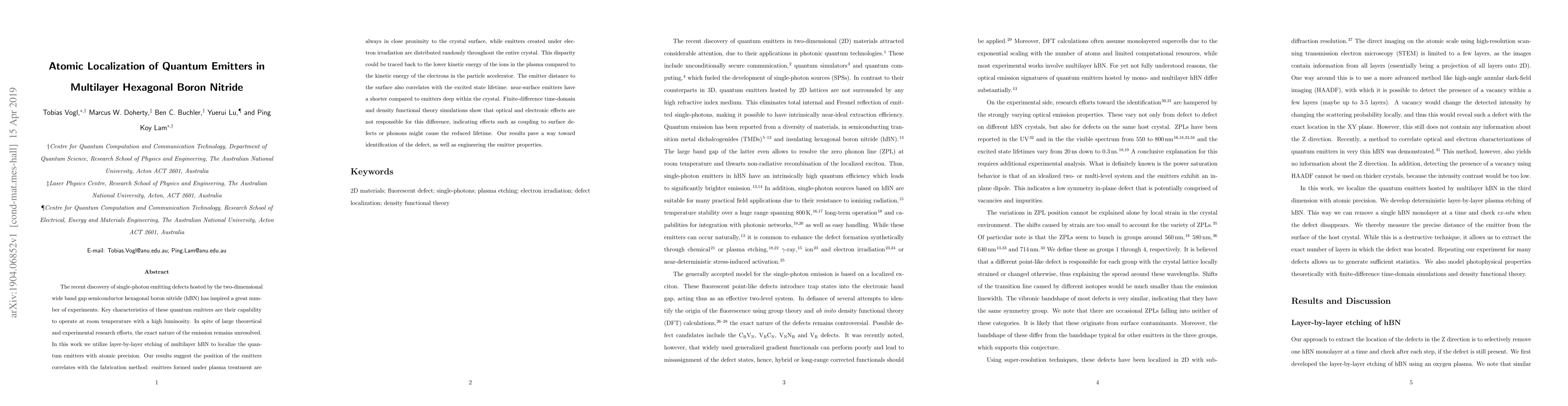 This research uses layer-by-layer etching to pinpoint quantum emitters in multilayer hexagonal boron nitride (hBN), finding they correlate with the creation method. Emitters from plasma treatment are near the surface, while electron irradiation creates random internal emitters. Near-surface emitters have shorter excited state lifetimes, possibly due to surface defect or phonon coupling. This localization aids in identifying the defect and engineering emitter properties.