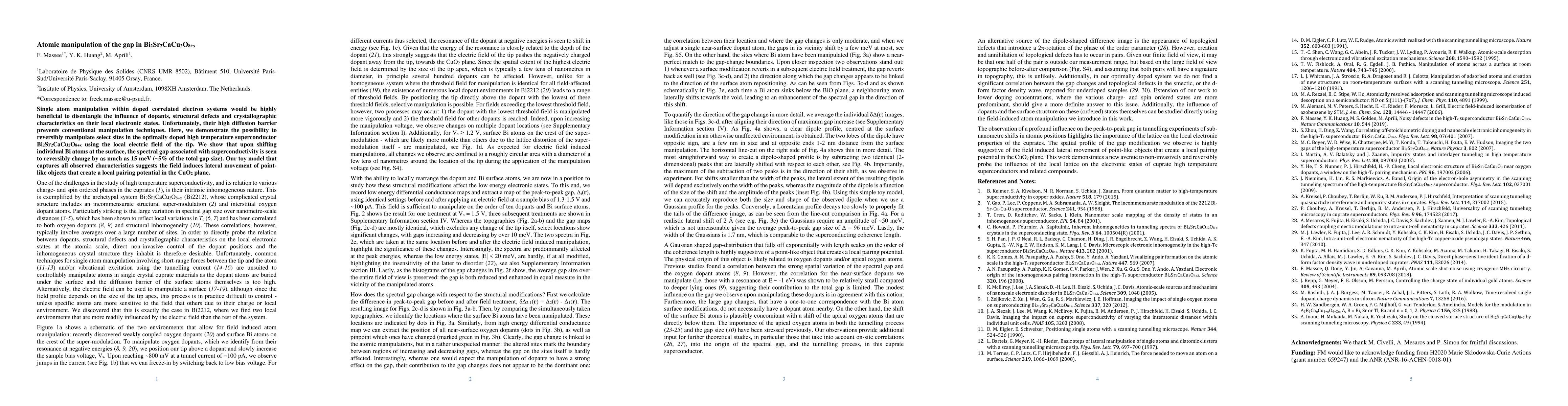 Single atom manipulation within doped correlated electron systems would be highly beneficial to disentangle the influence of dopants, structural defects and crystallographic characteristics on their local electronic states. Unfortunately, their high diffusion barrier prevents conventional manipulation techniques. Here, we demonstrate the possibility to reversibly manipulate select sites in the optimally doped high temperature superconductor Bi$_{2}$Sr$_{2}$CaCu$_{2}$O$_{8+x}$ using the local electric field of the tip. We show that upon shifting individual Bi atoms at the surface, the spectral gap associated with superconductivity is seen to reversibly change by as much as 15 meV (~5% of the total gap size). Our toy model that captures all observed characteristics suggests the field induces lateral movement of point-like objects that create a local pairing potential in the CuO2 plane.