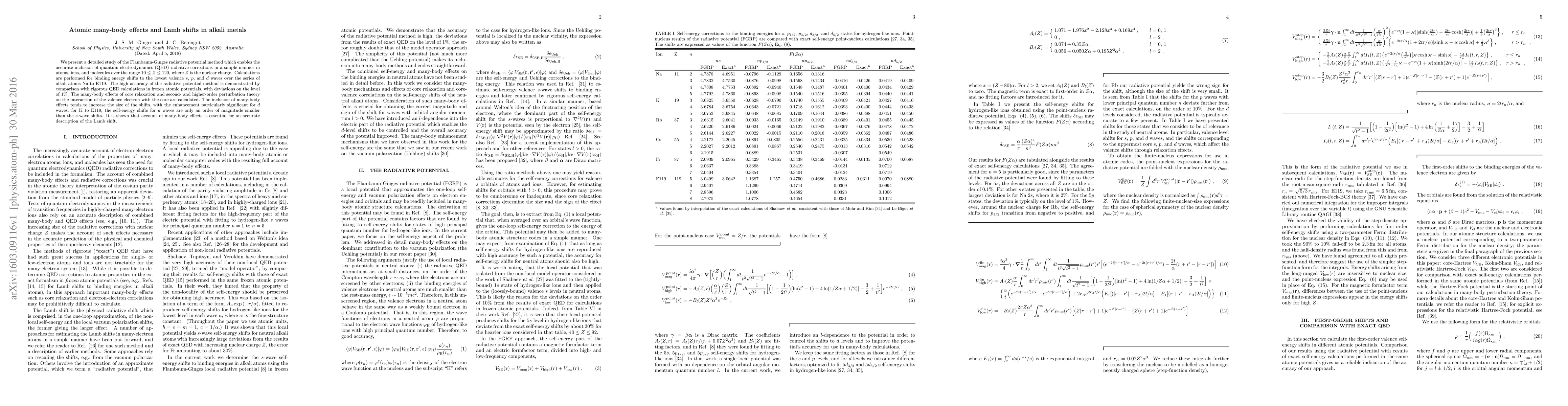 We present a detailed study of the Flambaum-Ginges radiative potential method which enables the accurate inclusion of quantum electrodynamics (QED) radiative corrections in a simple manner in atoms, ions, and molecules over the range 10<=Z<=120, where Z is the nuclear charge. Calculations are performed for binding energy shifts to the lowest valence s, p, and d waves over the series of alkali atoms Na to E119. The high accuracy of the radiative potential method is demonstrated by comparison with rigorous QED calculations in frozen atomic potentials, with deviations on the level of 1%. The many-body effects of core relaxation and second- and higher-order perturbation theory on the interaction of the valence electron with the core are calculated. The inclusion of many-body effects tends to increase the size of the shifts, with the enhancement particularly significant for d waves; for K to E119, the self-energy shifts for d waves are only an order of magnitude smaller than the s-wave shifts. It is shown that account of many-body effects is essential for an accurate description of the Lamb shift.