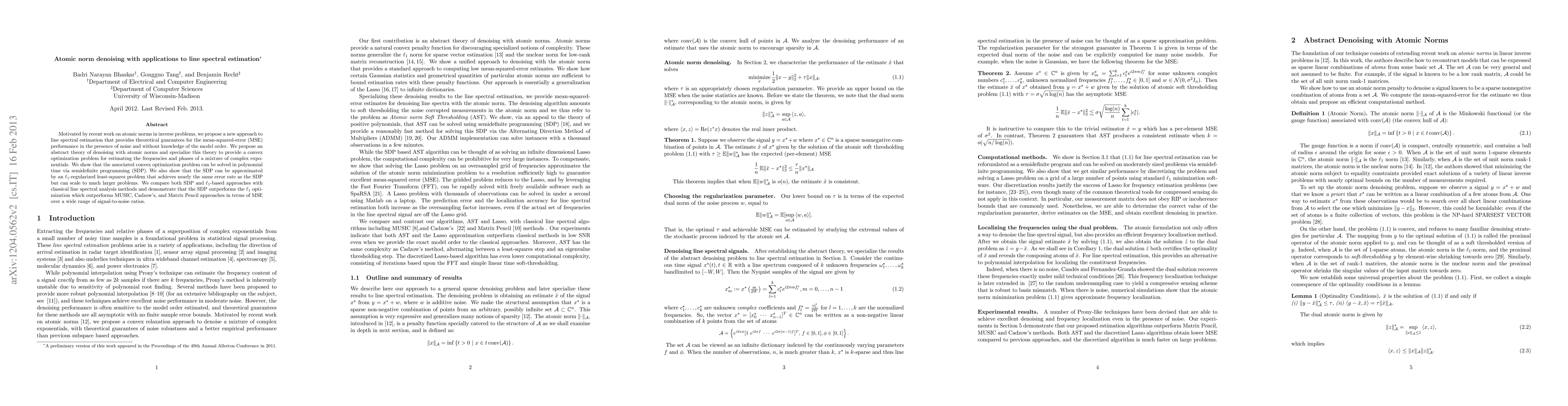 This paper proposes a new method for line spectral estimation using atomic norm denoising, providing theoretical guarantees for mean-squared-error performance without model order knowledge. The method involves a convex optimization problem solvable via semidefinite programming, which is scalable through an l1-regularized least-squares approximation.