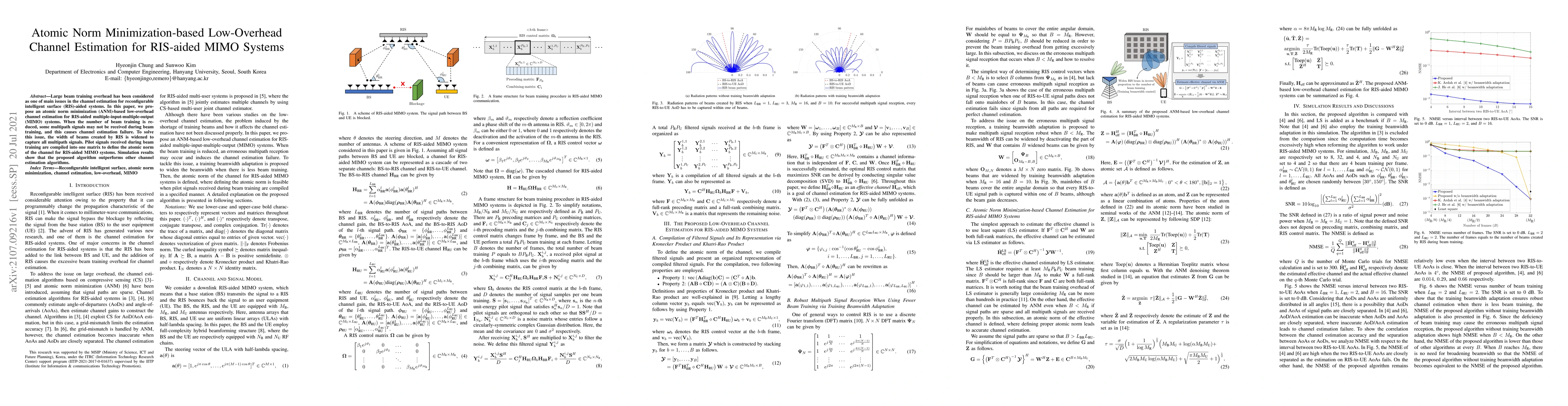 This paper proposes an atomic norm minimization (ANM)-based method for low-overhead channel estimation in RIS-aided MIMO systems, addressing the issue of large beam training overhead. The method widens beams to capture all multipath signals, compiling pilot signals into a matrix to define the atomic norm, resulting in improved performance over other algorithms.