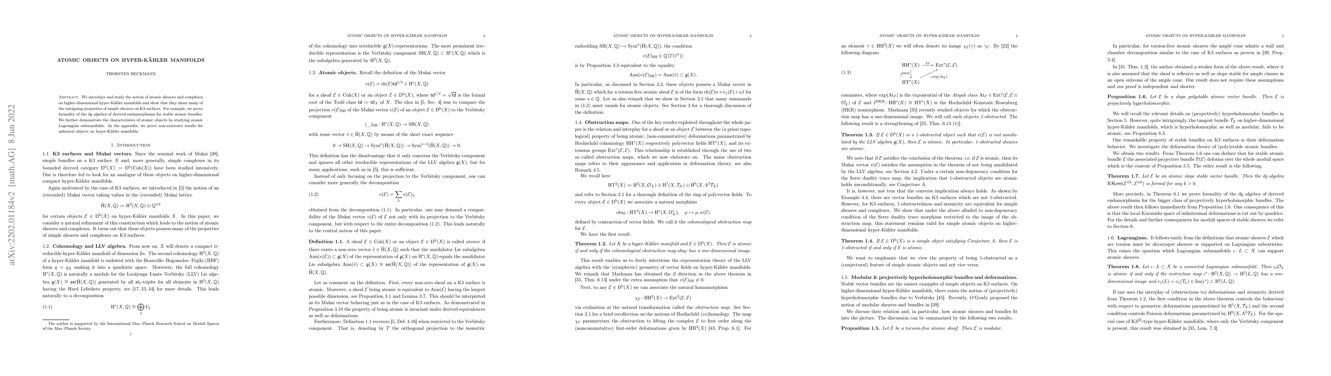 This paper introduces atomic sheaves and complexes on higher-dimensional hyper-Kähler manifolds, demonstrating their properties akin to simple sheaves on K3 surfaces, including formality of derived endomorphisms. It also explores atomic Lagrangian submanifolds and concludes with non-existence results for spherical objects on these manifolds.