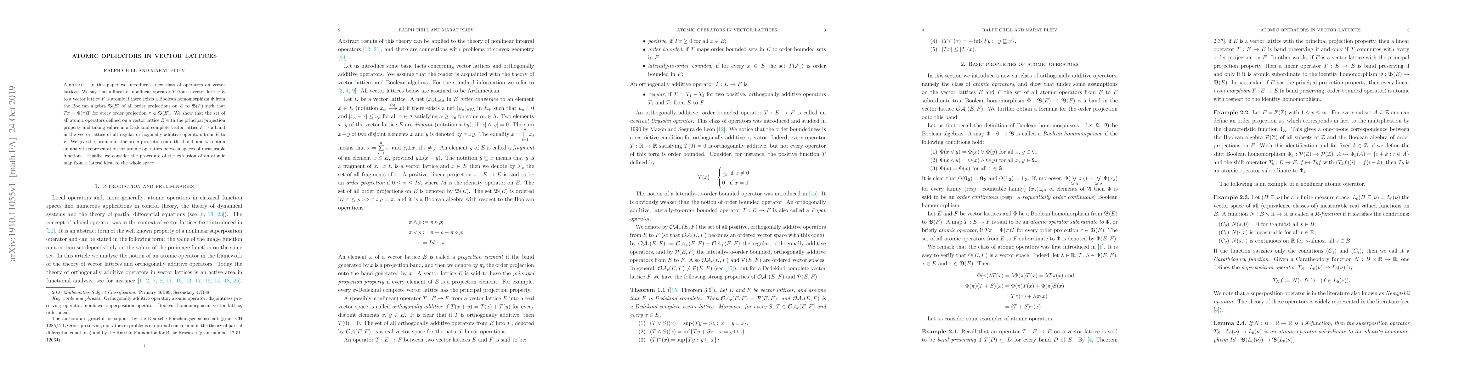In this paper we introduce a new class of operators on vector lattices. We say that a linear or nonlinear operator $T$ from a vector lattice $E$ to a vector lattice $F$ is atomic if there exists a Boolean homomorphism $\Phi$ from the Boolean algebra $\mathfrak{B}(E)$ of all order projections on $E$ to $\mathfrak{B}(F)$ such that $T\pi=\Phi(\pi)T$ for every order projection $\pi\in\mathfrak{B}(E)$. We show that the set of all atomic operators defined on a vector lattice $E$ with the principal projection property and taking values in a Dedekind complete vector lattice $F$, is a band in the vector lattice of all regular orthogonally additive operators from $E$ to $F$. We give the formula for the order projection onto this band, and we obtain an analytic representation for atomic operators between spaces of measurable functions. Finally, we consider the procedure of the extension of an atomic map from a lateral ideal to the whole space.