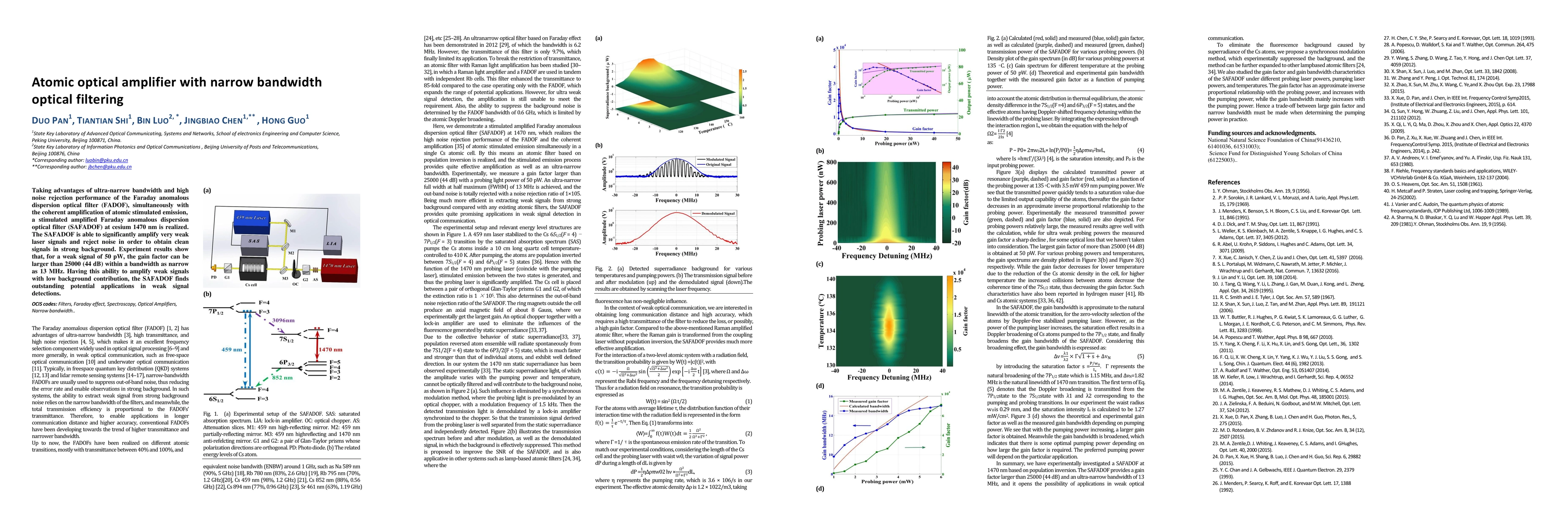 Taking advantages of ultra-narrow bandwidth and high noise rejection performance of the Faraday anomalous dispersion optical filter (FADOF), simultaneously with the coherent amplification of atomic stimulated emission, a stimulated amplified Faraday anomalous dispersion optical filter (SAFADOF) at cesium 1470 nm is realized. The SAFADOF is able to significantly amplify very weak laser signals and reject noise in order to obtain clean signals in strong background. Experiment results show that, for a weak signal of 50 pW, the gain factor can be larger than 25000 (44 dB) within a bandwidth as narrow as 13 MHz. Having this ability to amplify weak signals with low background contribution, the SAFADOF finds outstanding potential applications in weak signal detections.