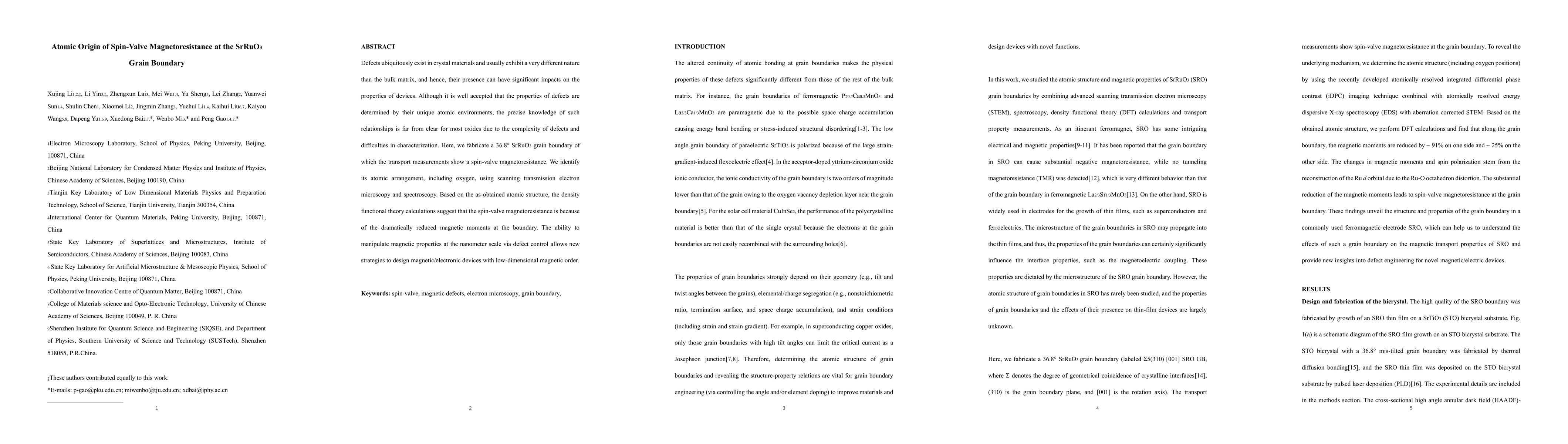 Defects ubiquitously exist in crystal materials and usually exhibit a very different nature than the bulk matrix, and hence, their presence can have significant impacts on the properties of devices. Although it is well accepted that the properties of defects are determined by their unique atomic environments, the precise knowledge of such relationships is far from clear for most oxides due to the complexity of defects and difficulties in characterization. Here, we fabricate a 36.8{\deg} SrRuO3 grain boundary of which the transport measurements show a spin-valve magnetoresistance. We identify its atomic arrangement, including oxygen, using scanning transmission electron microscopy and spectroscopy. Based on the as-obtained atomic structure, the density functional theory calculations suggest that the spin-valve magnetoresistance is because of the dramatically reduced magnetic moments at the boundary. The ability to manipulate magnetic properties at the nanometer scale via defect control allows new strategies to design magnetic/electronic devices with low-dimensional magnetic order.
