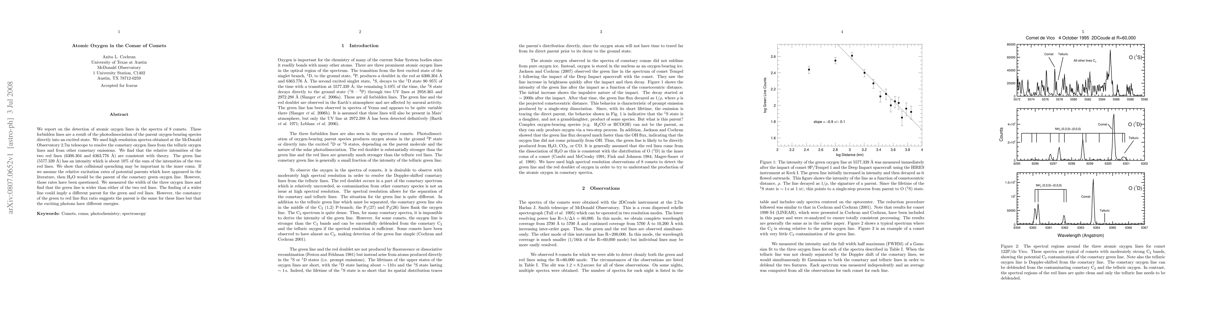 We report on the detection of atomic oxygen lines in the spectra of 8 comets. These forbidden lines are a result of the photodissociation of the parent oxygen-bearing species directly into an excited state. We used high resolution spectra obtained at the McDonald Observatory 2.7m telescope to resolve the cometary oxygen lines from the telluric oxygen lines and from other cometary emissions. We find that the relative intensities of the two red lines (6300.304 and 6363.776A) are consistent with theory. The green line (5577.339A) has an intensity which is about 10% of the sum of the intensities of the two red lines. We show that collisional quenching may be important in the inner coma. If we assume the relative excitation rates of potential parents which have appeared in the literature, then H2O would be the parent of the cometary green oxygen line. However, those rates have been questioned. We measured the width of the three oxygen lines and find that the green line is wider than either of the two red lines. The finding of a wider line could imply a different parent for the green and red lines. However, the constancy of the green to red line flux ratio suggests the parent is the same for these lines but that the exciting photons have different energies.