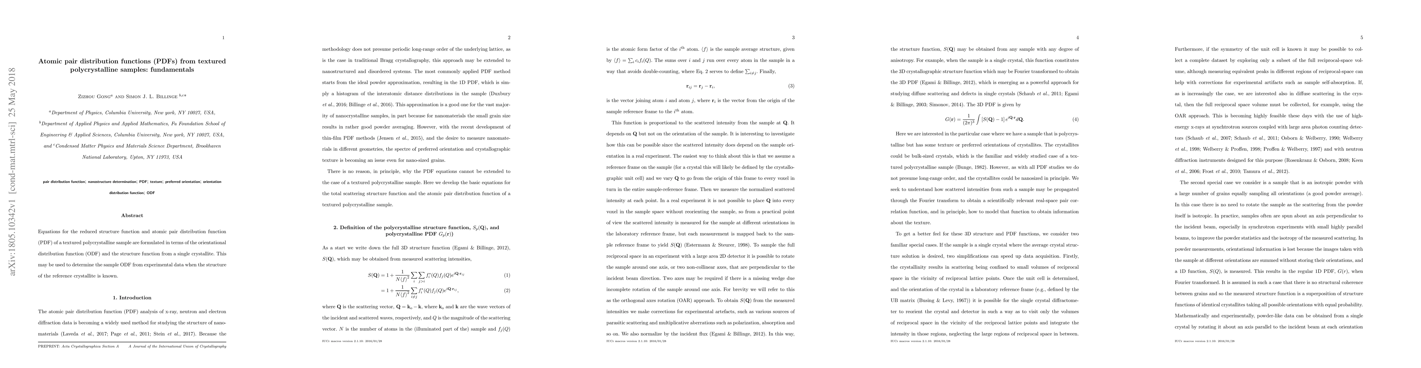 Equations for the reduced structure function and atomic pair distribution function (PDF) of a textured polycrystalline sample are formulated in terms of the orientational distribution function (ODF) and the structure function from a single crystallite. This may be used to determine the sample ODF from experimental data when the structure of the reference crystallite is known.