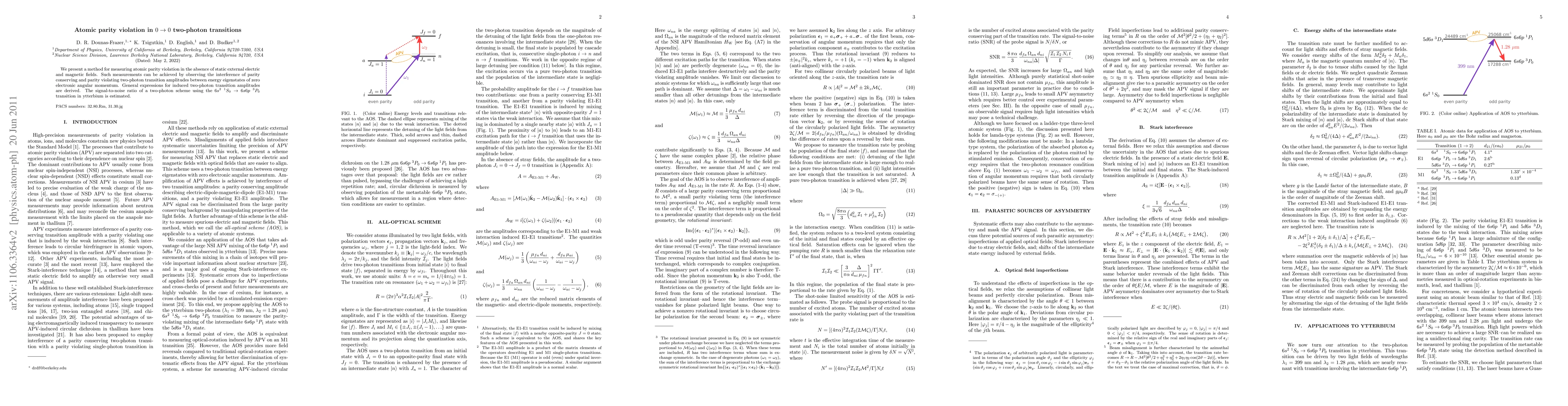This paper proposes a method to measure atomic parity violation through two-photon transitions in states with zero electronic angular momentum, deriving general expressions for these transition amplitudes. It also estimates the signal-to-noise ratio for a specific two-photon scheme in ytterbium.