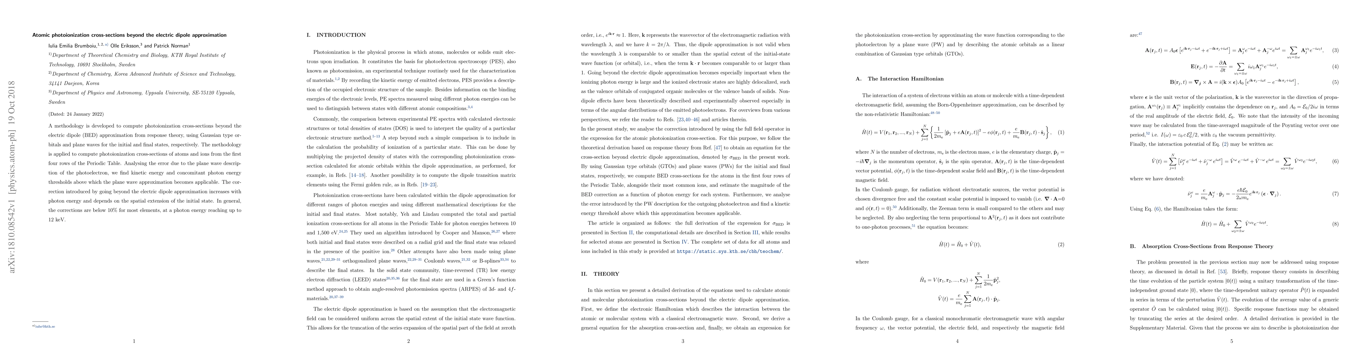 A methodology is developed to compute photoionization cross-sections beyond the electric dipole (BED) approximation from response theory, using Gaussian type orbitals and plane waves for the initial and final states, respectively. The methodology is applied to compute photoionization cross-sections of atoms and ions from the first four rows of the Periodic Table. Analysing the error due to the plane wave description of the photoelectron, we find kinetic energy and concomitant photon energy thresholds above which the plane wave approximation becomes applicable. The correction introduced by going beyond the electric dipole approximation increases with photon energy and depends on the spatial extension of the initial state. In general, the corrections are below 10% for most elements, at a photon energy reaching up to 12 keV.