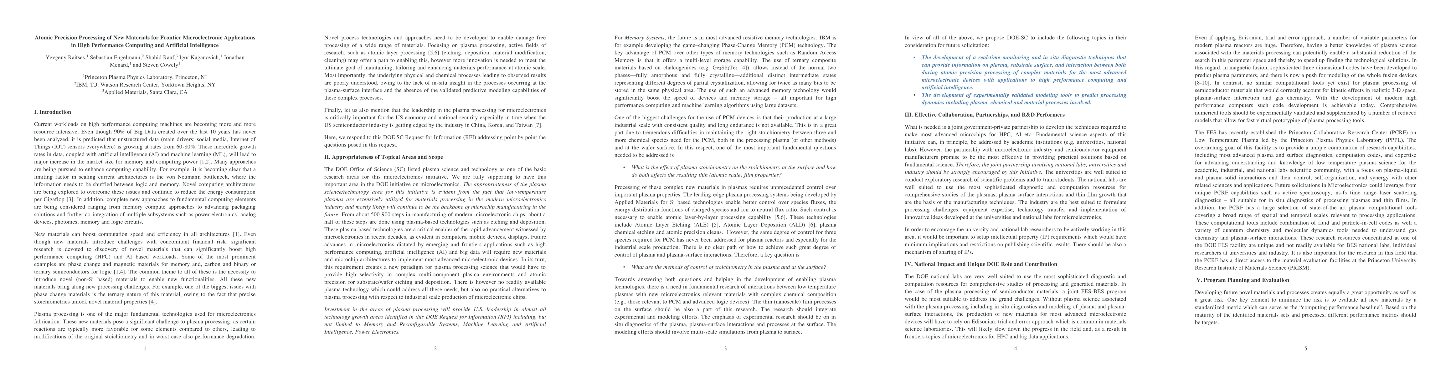 This document is a joint response by scientists from the Princeton Plasma Physics Laboratory, IBM T. J. Watson Research Center and Applied Materials, Inc. to the DOE Office of Science (DOE-SC) Request for Information: Basic Research Initiative for Microelectronics (https://www.federalregister.gov/documents/2019/07/12/2019-14869/request-for-information-basic-research-initiative-for-microelectronics). Specifically, we propose DOE-SC to include the following topics in their consideration for future solicitations on Microelectronics: 1) The development of a real-time monitoring and in-situ diagnostic techniques that can provide information on plasma, substrate surface, and interaction between both during atomic precision processing of complex materials for the most advanced microelectronic devices with applications to high performance computing and artificial intelligence, and 2) The development of experimentally validated modeling tools to predict processing dynamics including plasma, chemical and material processes involved.