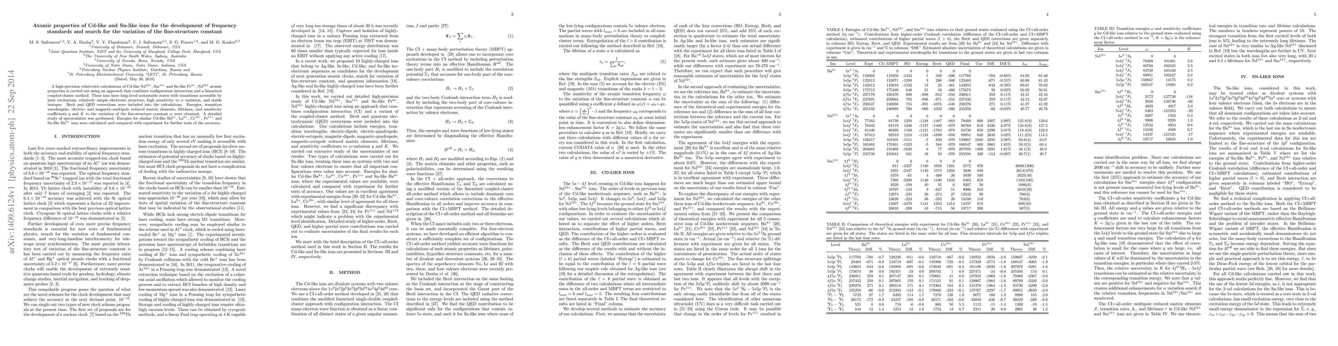 A high-precision relativistic calculations of Cd-like Nd$^{12+}$, Sm$^{14+}$ and Sn-like Pr$^{9+}$, Nd$^{10+}$ atomic properties is carried out using an approach that combines configuration interaction and a linearized coupled-cluster method. These ions have long-lived metastable states with transitions accessible by laser excitations, relatively simple electronic structure, high sensitivity to $\alpha$ variation, and stable isotopes. Breit and QED corrections were included into the calculations. Energies, transition wavelengths, electric- and magnetic-multipole reduced matrix elements, lifetimes, and sensitivity coefficients $q$ and $K$ to the variation of the fine-structure constant $\alpha$ were obtained. A detailed study of uncertainties was performed. Energies for similar Cd-like Ba$^{8+}$, La$^{9+}$, Ce$^{10+}$, Pr$^{11+}$ and Sn-like Ba$^{6+}$ ions were calculated and compared with experiment for further tests of the accuracy.