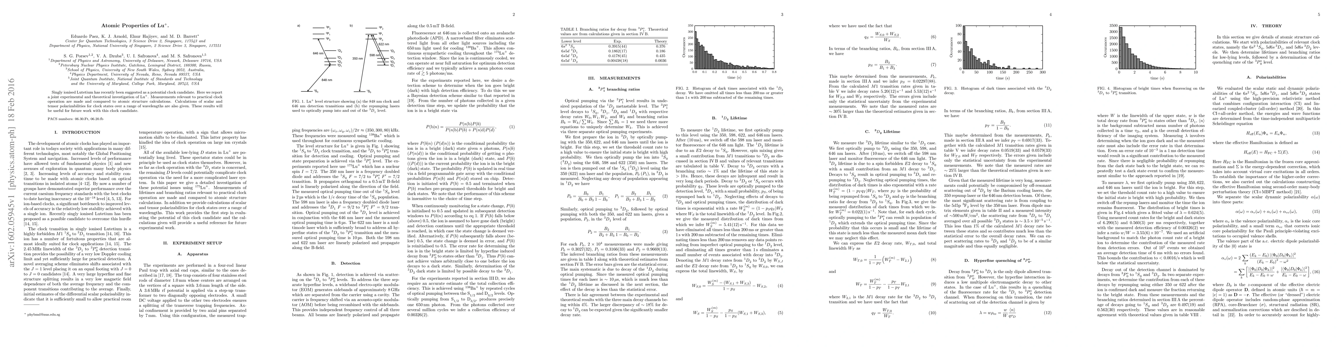 Singly ionised Lutetium has recently been suggested as a potential clock candidate. Here we report a joint experimental and theoretical investigation of \ce{Lu^+}. Measurements relevant to practical clock operation are made and compared to atomic structure calculations. Calculations of scalar and tensor polarizabilities for clock states over a range of wavelengths are also given. These results will be useful for future work with this clock candidate.